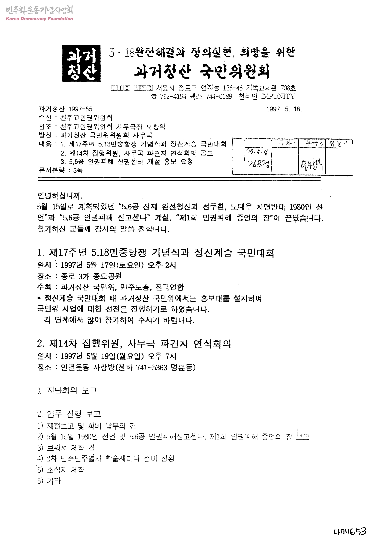 제17주년 5.18민중항쟁 기념식과 정신계승 국민대회, 제14차 집행위원, 사무국 파견자 연석회의 공고, 5,6공 인권피해 신권센타 개설 홍보 요청[수신:천주교인권위원회, 발신:과거청산 국민위위원회 사무국]