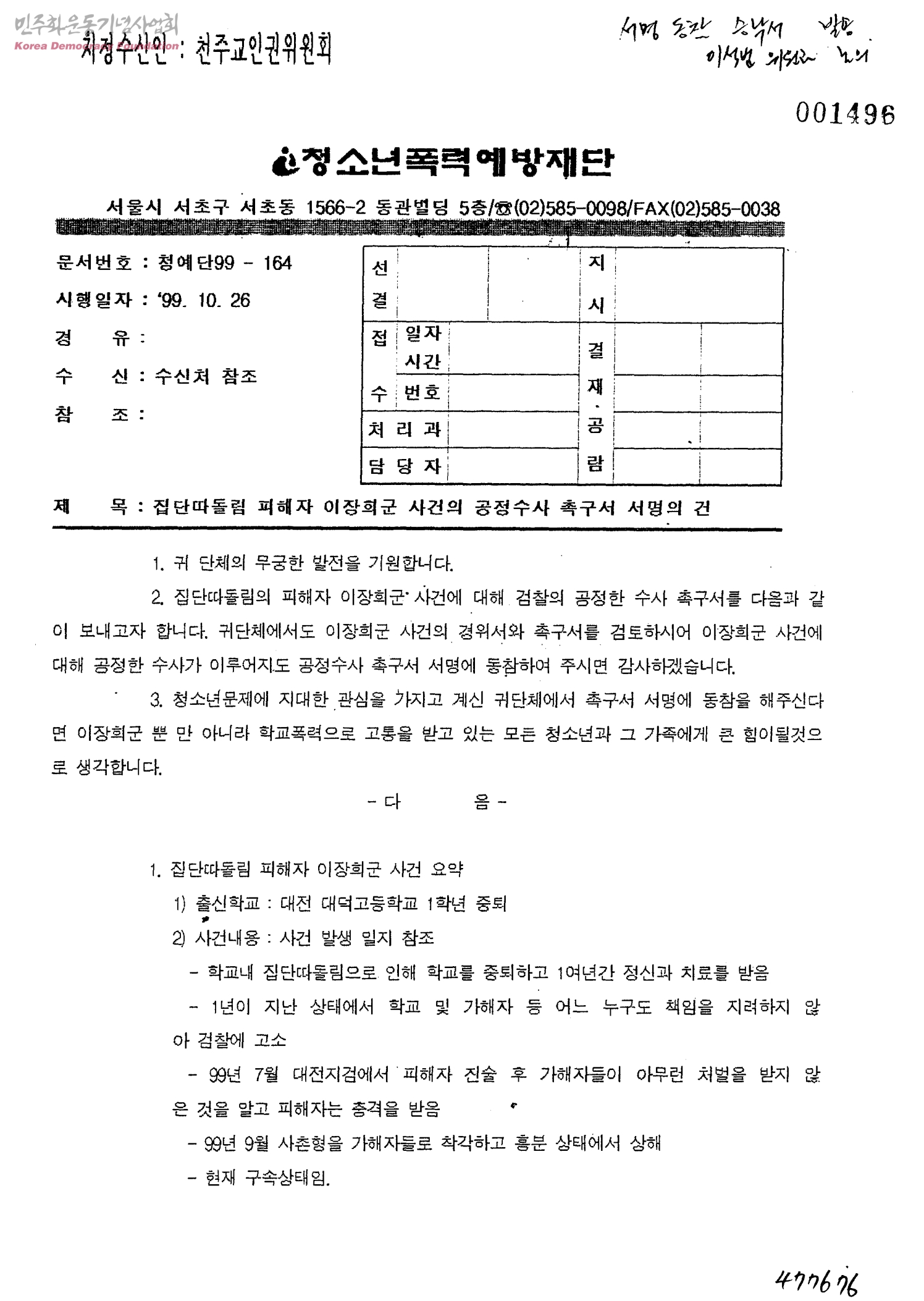 집단따돌림 피해자 이장희군 사건의 공정수사 촉구서 서명의 건[수신:시민단체 및 청소년단체]