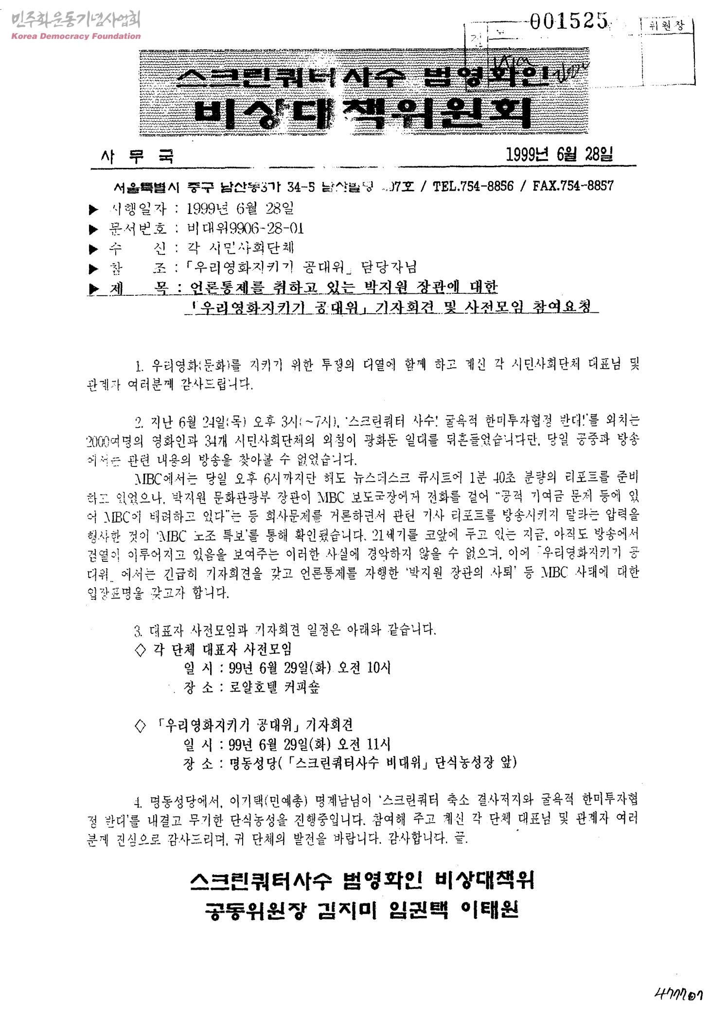 언론통제를 취하고 있는 박지원 장관에 대한 「우리영화지키기 공대위」기자회견 및 사전모임 참가요청[수신:각 시민사회단체]