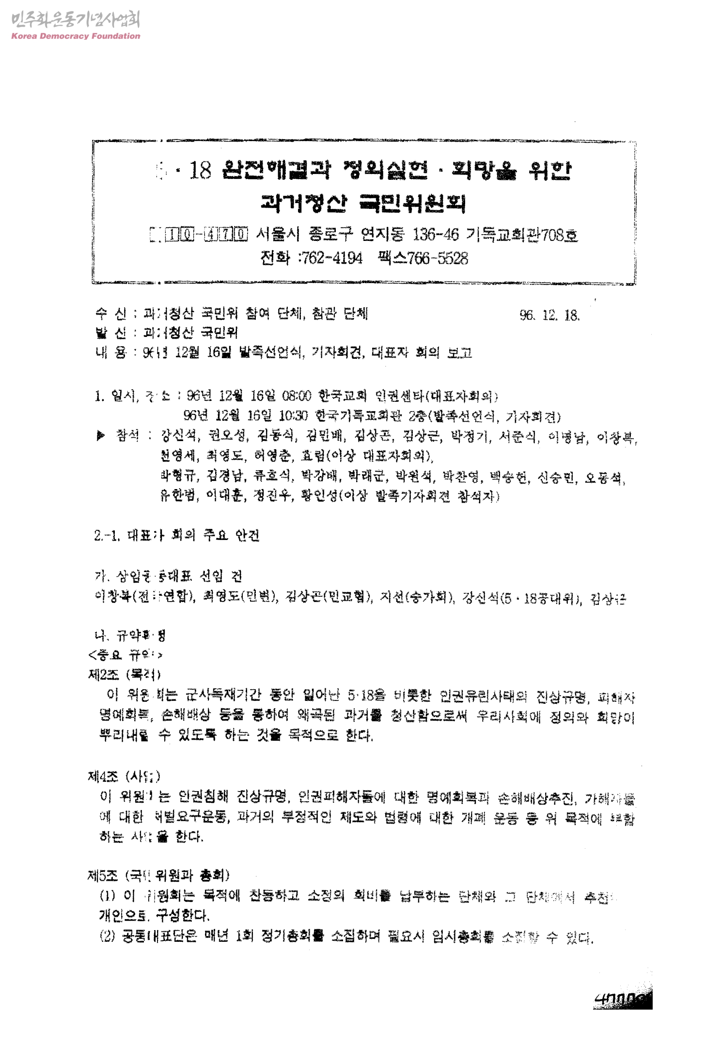 96년 12월 16일 발족선언식, 기자회견, 대표자 회의보고[수신:과거청산 국민위 참여 단체, 참관 단체, 발신:과거청산 국민위]