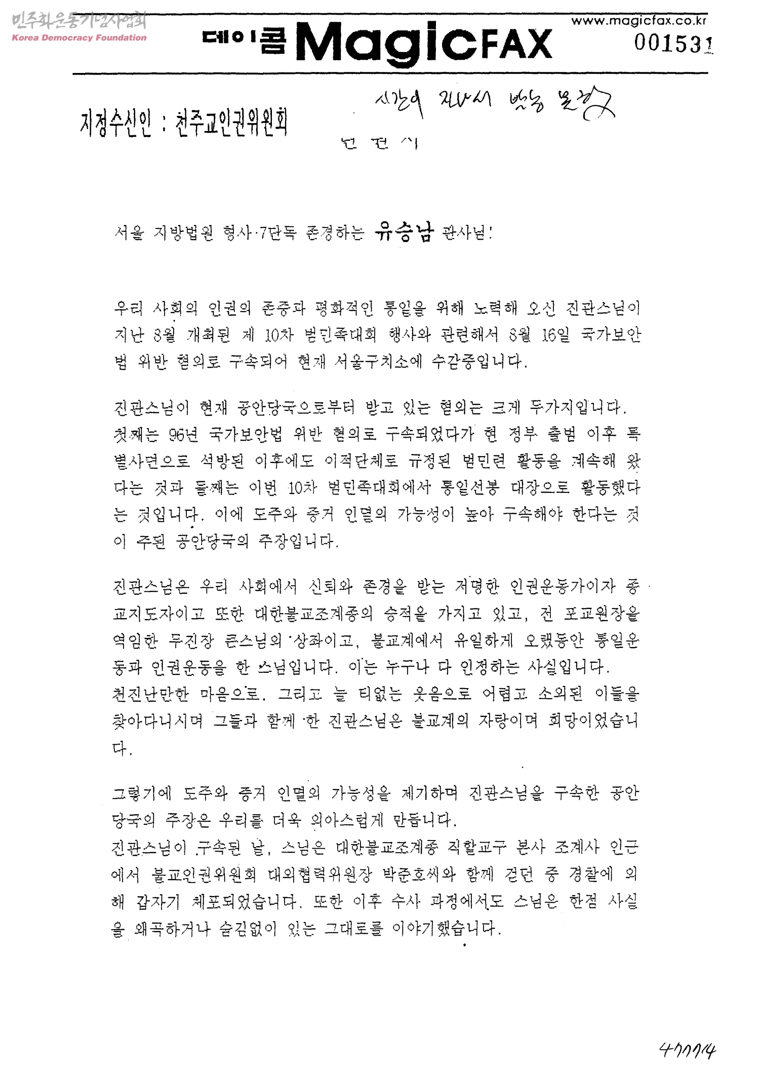탄원서[대한불교조계종교구본사주지연합회가 유승남 판사님에게 보내는 진관스님 석방에 관련된 건]
