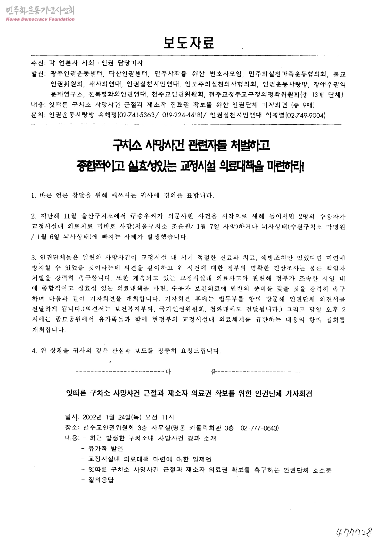 보도자료-잇따른 구치소 사망사건 근절과 재소자 진료권 확보를 위한 인권단체 기자회견[수신:각 언론사 사회 · 인권 담당기자]