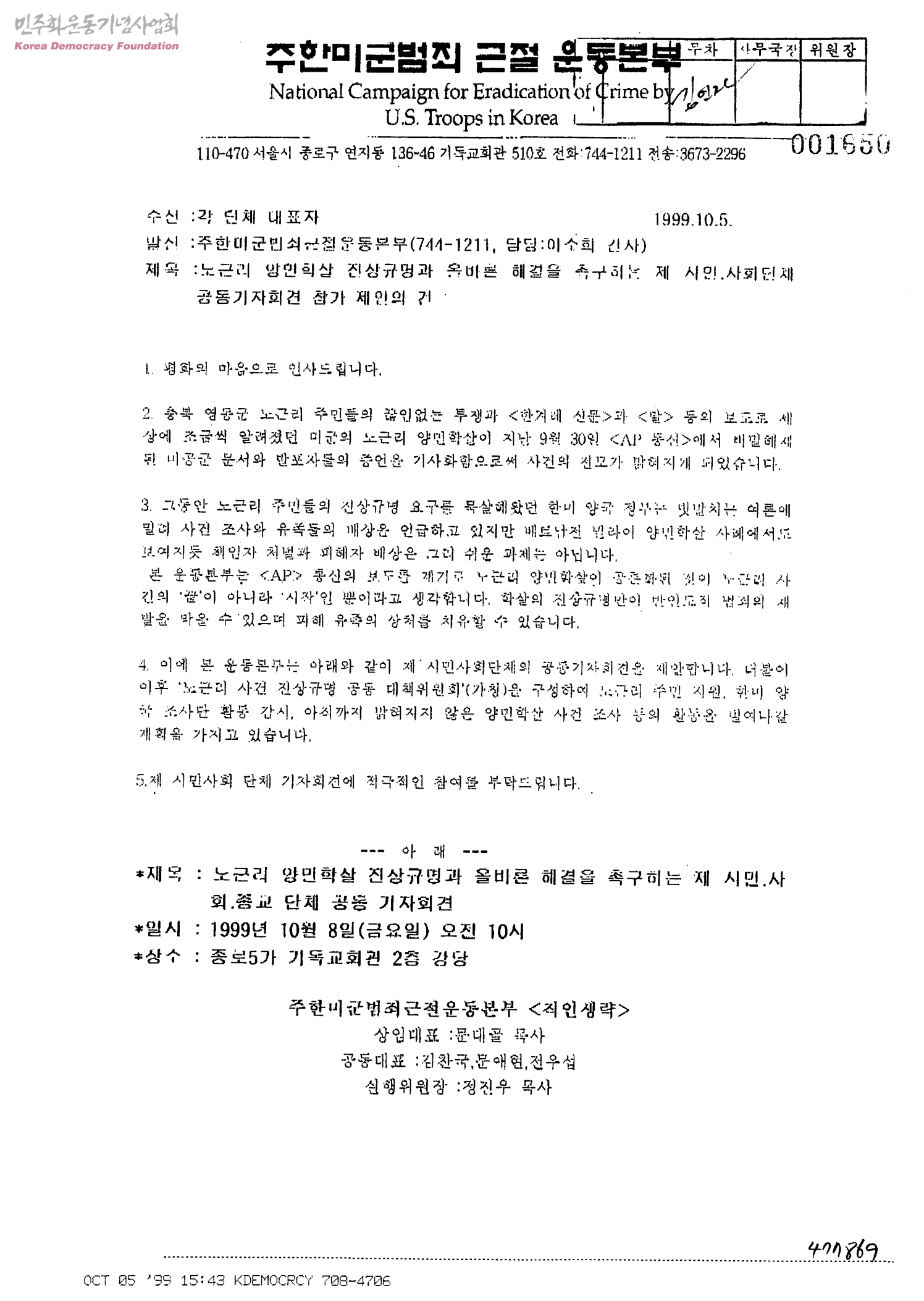 노근리 양민학살 진상규명과 올바른 해결을 촉구하는 제 시민 사회단체 공동기자회견 참가 제안의 건[수신:각 단체 대표자, 발신:주한미군범죄근절운동본부]