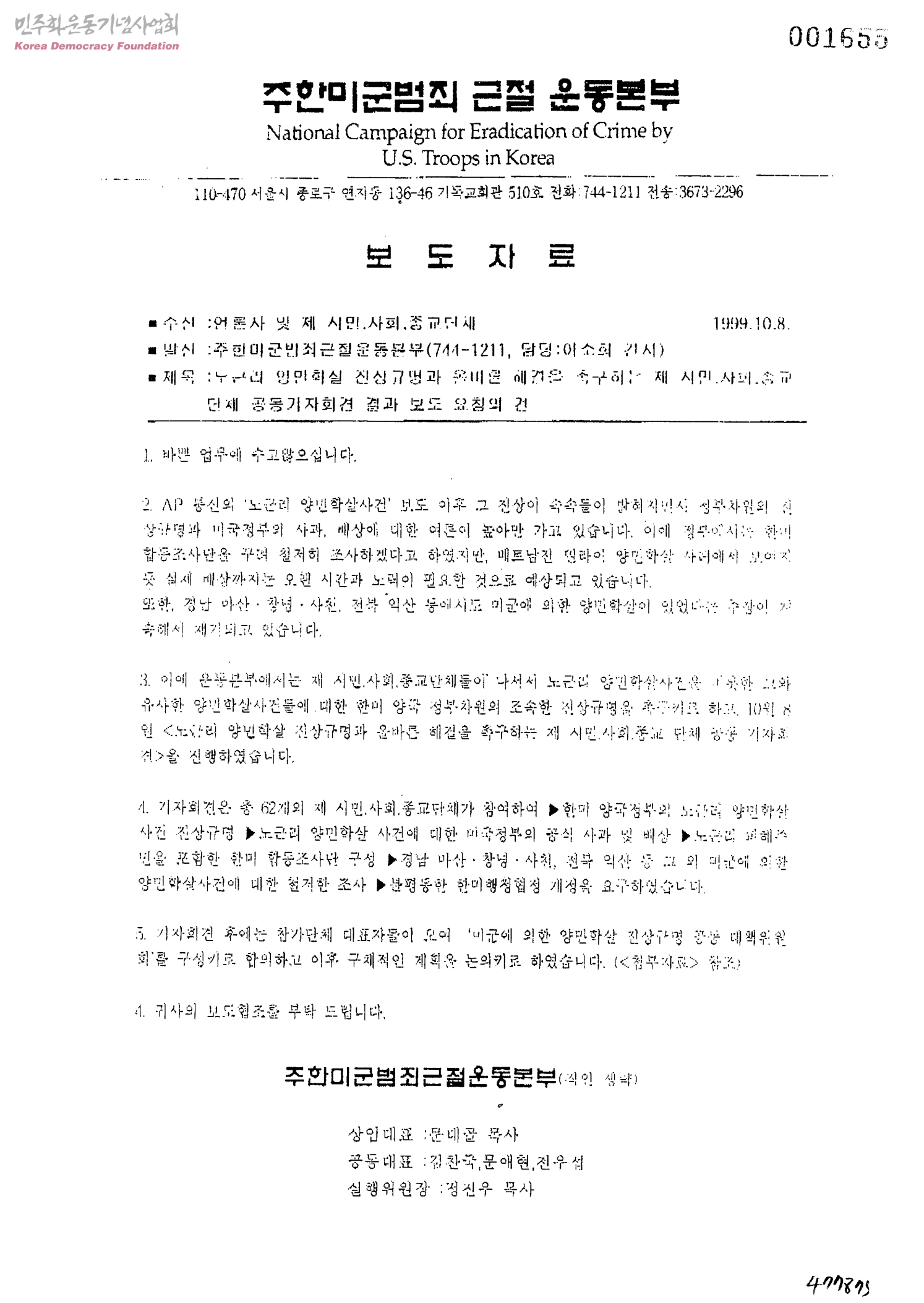 노근리 양민학살 진상규명과 올바른 해결을 촉구하는 제 시민, 사회, 종교 단체 공동기자회견 결과 보도 요청의 건[수신:언론사 및 제 시민, 사회, 종교단체, 발신:주한미군범죄근절운동본부]