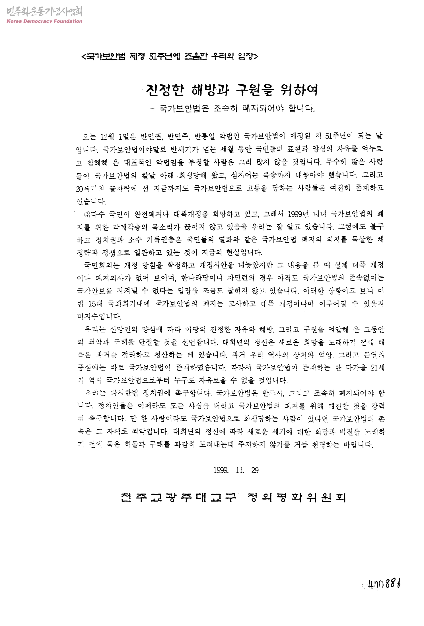국가보안법 제정 51주년에 즈음한 우리의 입장-진정한 해방과 구원을 위하여-국가보안법은 조속히 폐지되어야 합니다.