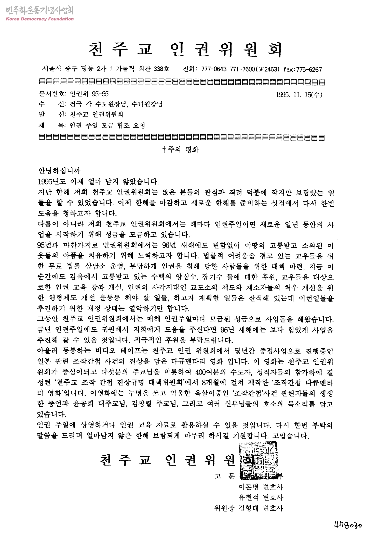 인권 주일 모금 협조 요청[수신:전국 각 수도원장님, 수녀원장님, 발신:천주교 인권위원회]