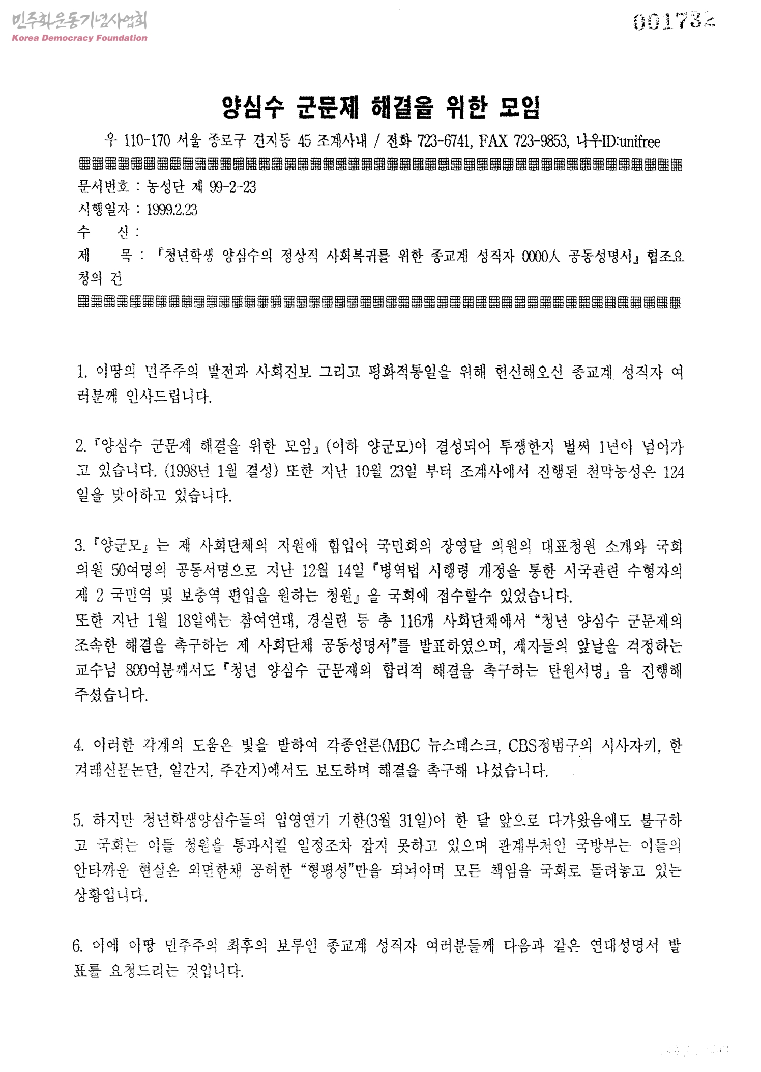 「청년학생 양심수의 정상적 사회복귀를 위한 종교계 성직자 0000人 공동성명서」협조요청의 건