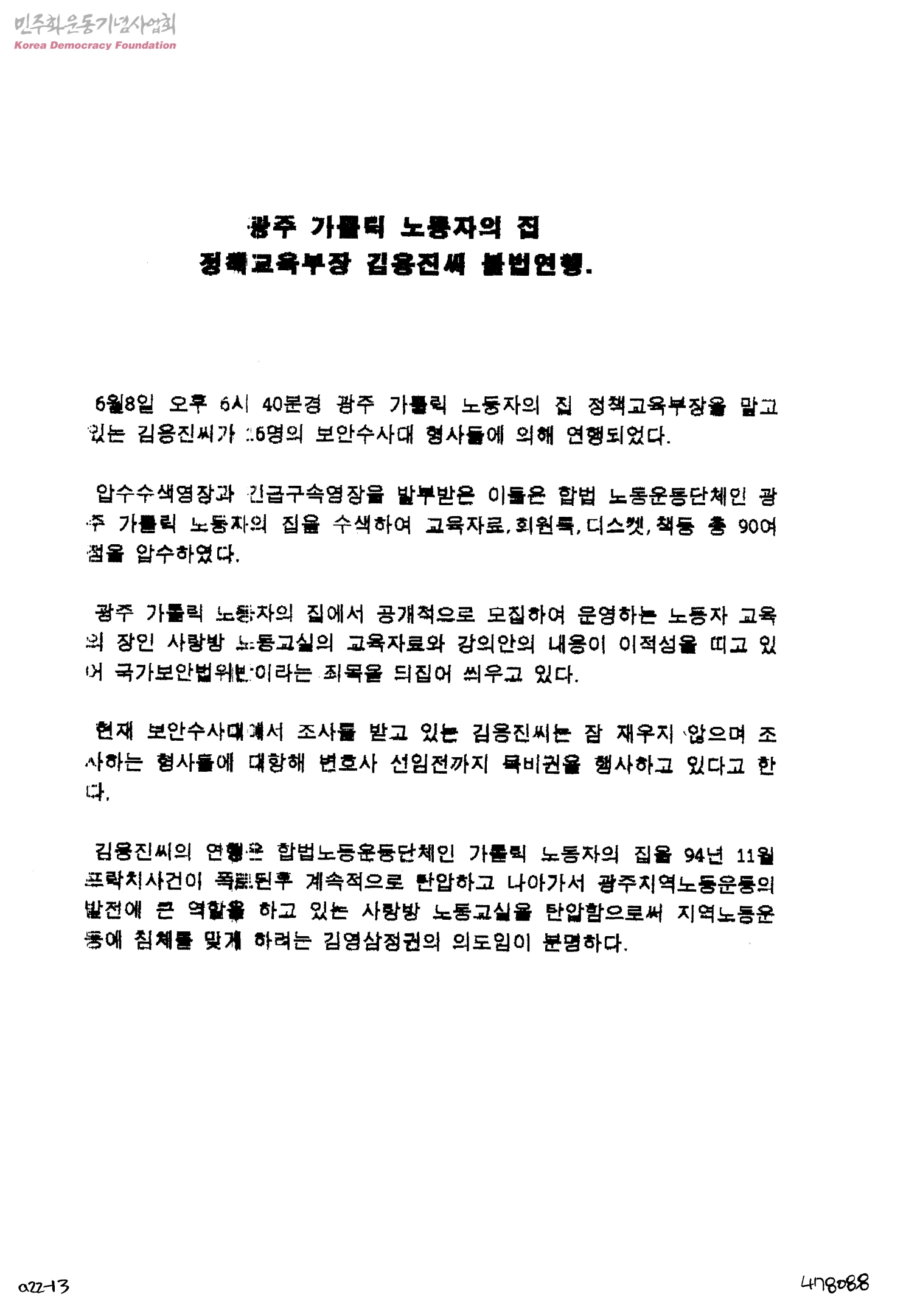 광주 가톨릭 노동자의 집 정책교육부장 김용진씨 불법연행