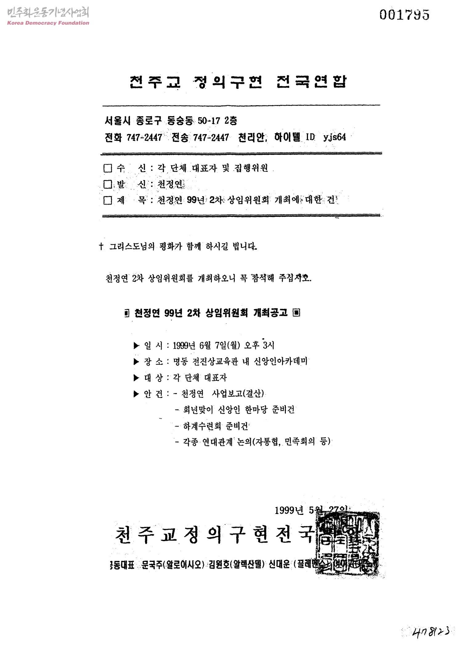 천정연 99년 2차 상임위원회 개최에 대한 건[수신:각 단체 대표자 및 집행위원, 발신:천정연]