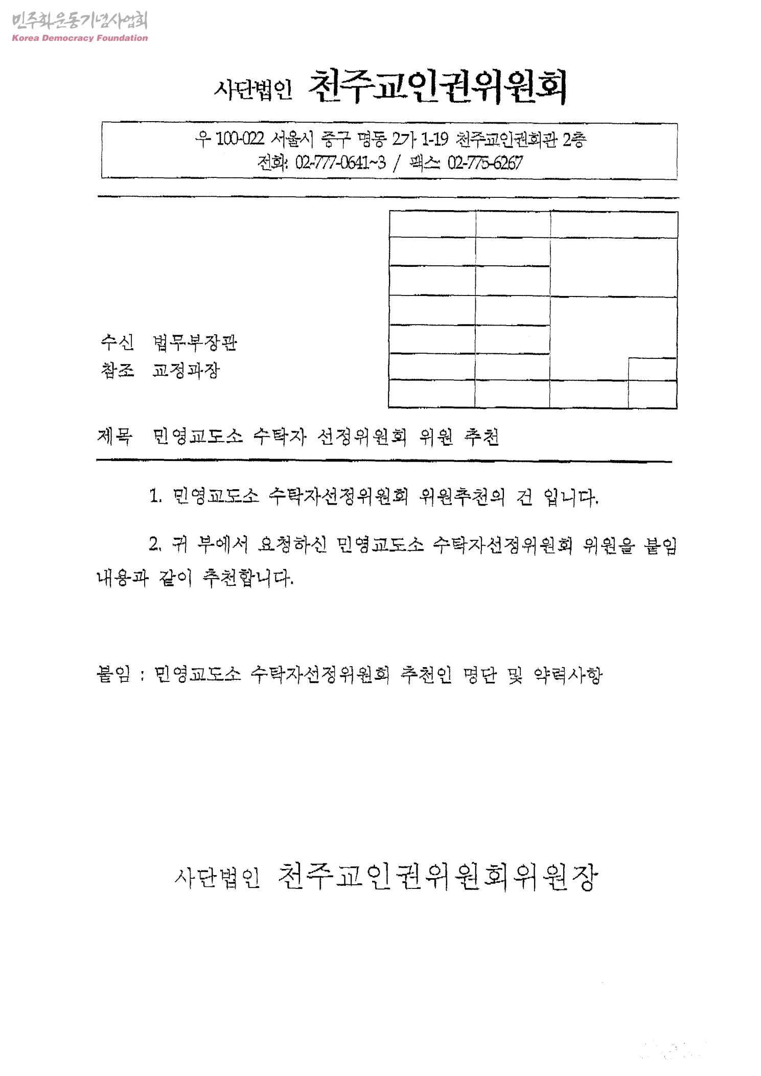 - 법무부에서 천주교인권위원회에 먼저 민영교도소위원회 위원 추천 의뢰를 해 옴(세번째장 사료). ※ 첨부: 민영교도소 수탁자선정위원회 추천인 명단 및 약력사항.