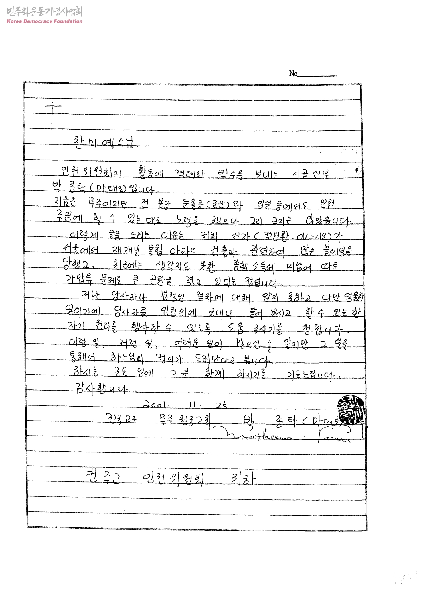 [박종탁 마태오가 천주교 인권위원호에 보내는 정민환 이냐시오의 재개발 복합 아파트 건축과 관련하여 당한 불이익에 관해]
