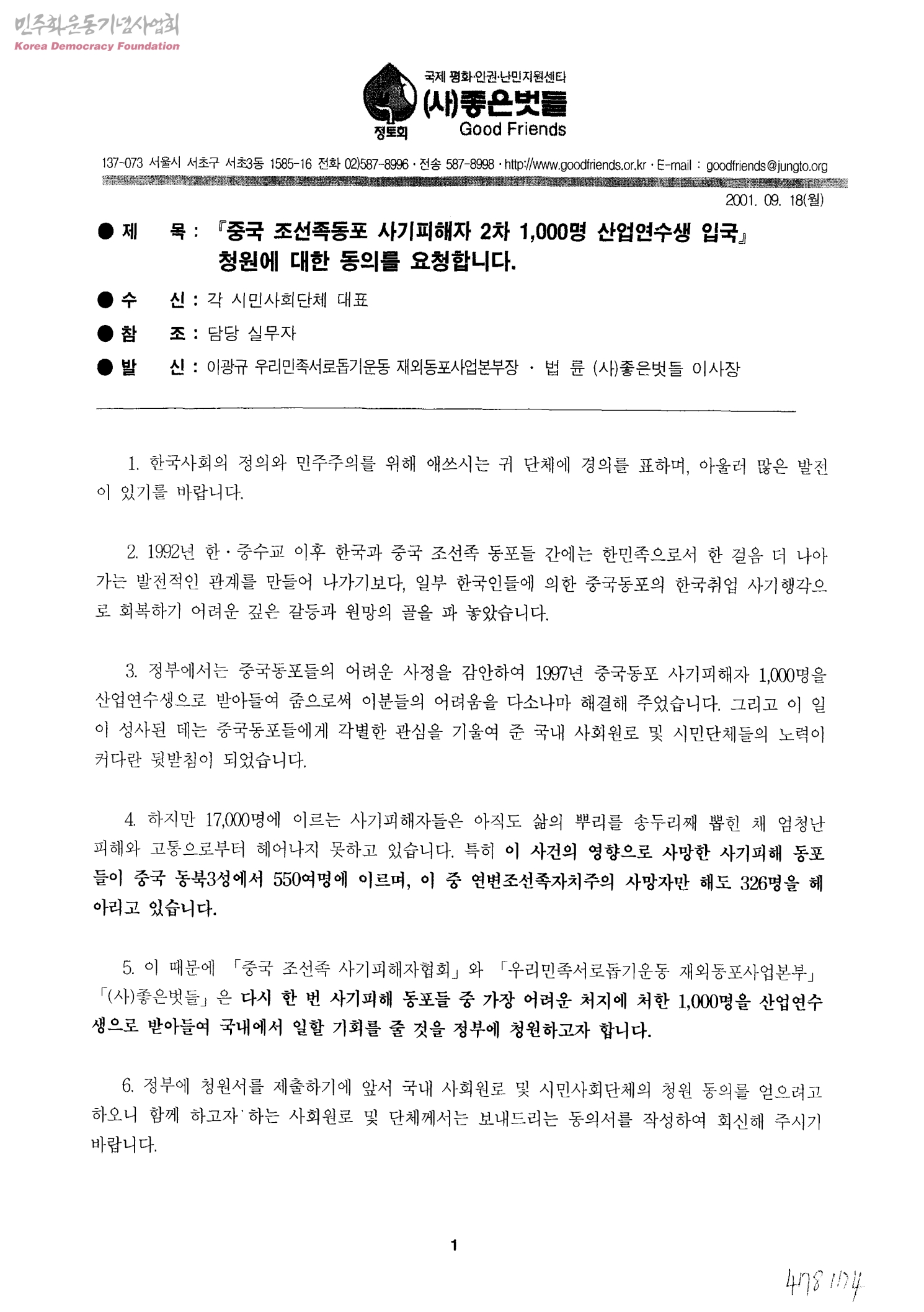 중국 조선족동포 사기피해자 2차 1,000명 산업연수생 입국 청원에 대한 동의를 요청합니다. [수신:각 시민사회단체대표, 발신:이광규,법륜]