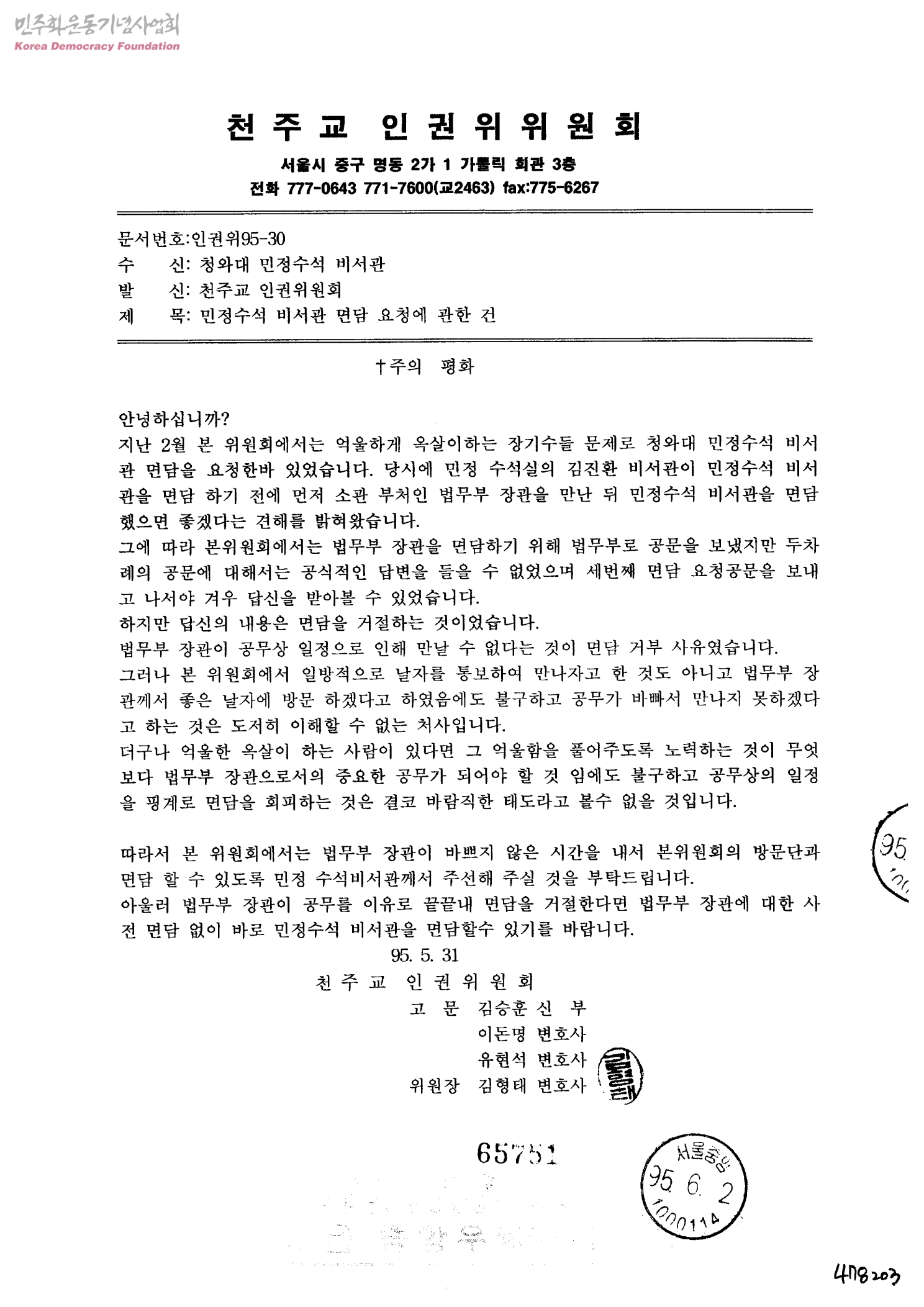민정수석 비서관 면담 요청에 관한 건[수신:청와대 민정수석 비서관, 발신:천주교 인권위원회]