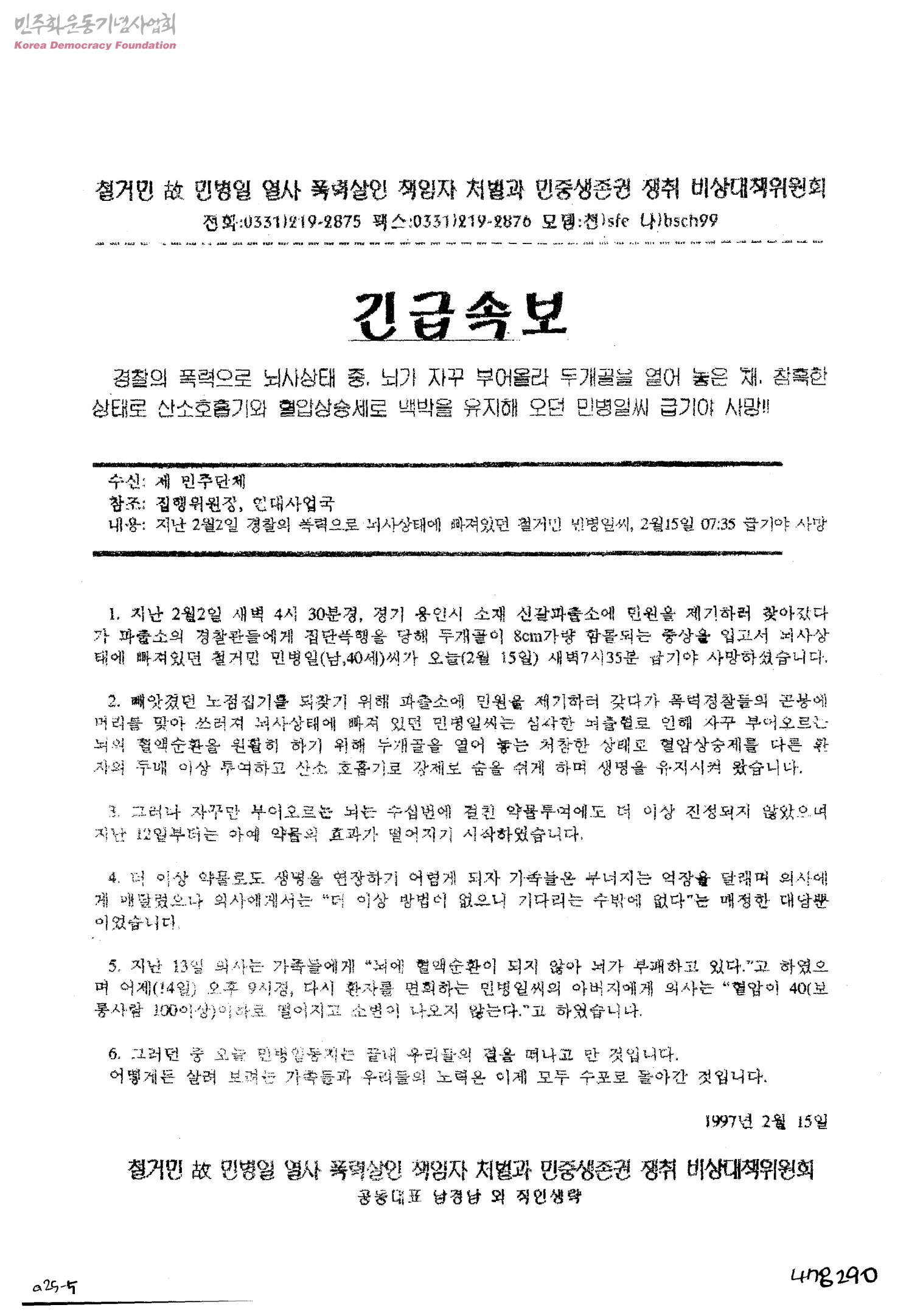 지난 2월2일 경찰의 폭력으로 뇌사상태에 빠져있던 철거민 민병일씨, 2월 15일 07:35 급기야 사망[수신:제 민주단체]
