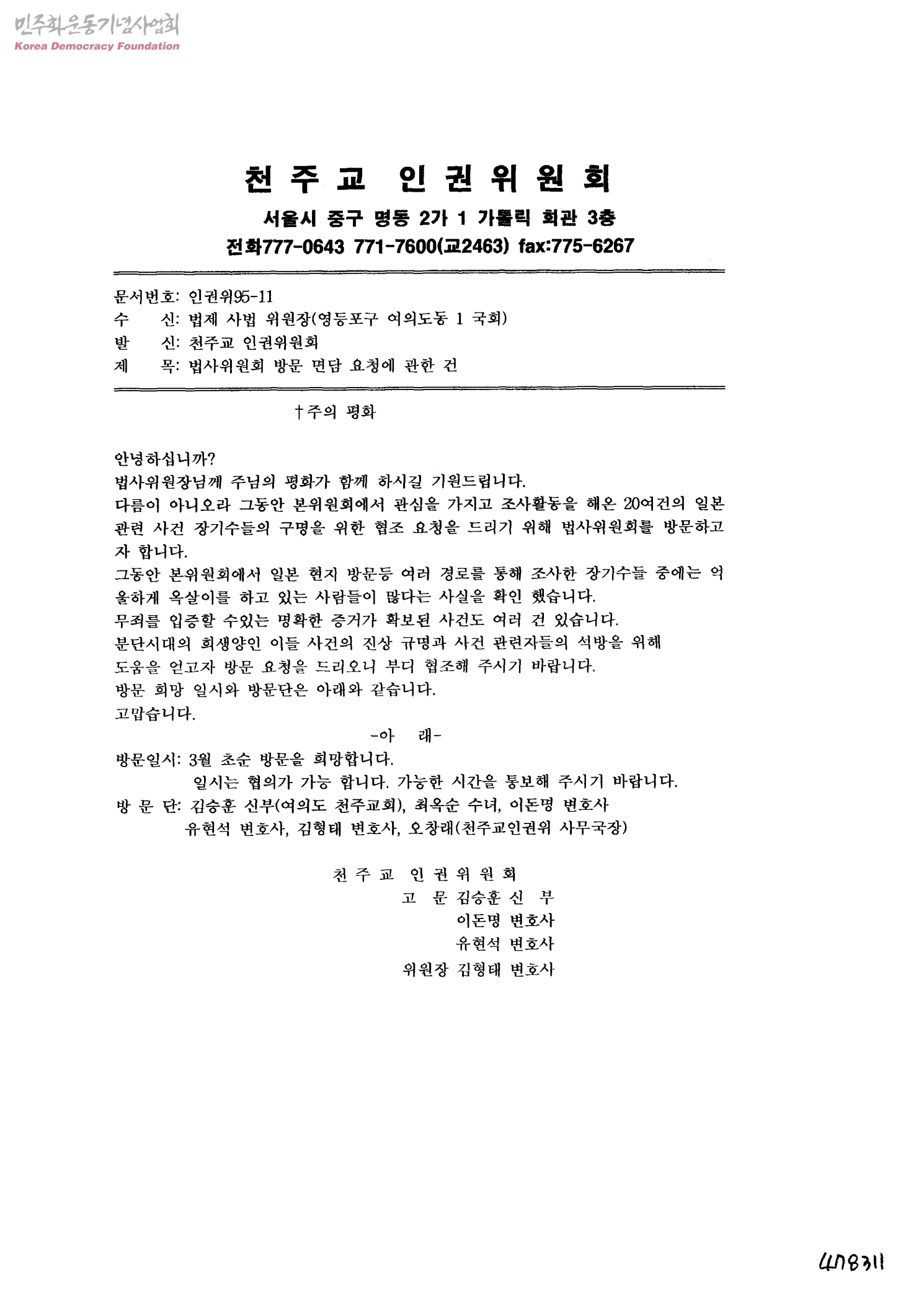 법사위원회 방문 면담 요청에 관한 건[수신:법제 사법 위원장, 발신:천주교 인권위원회]