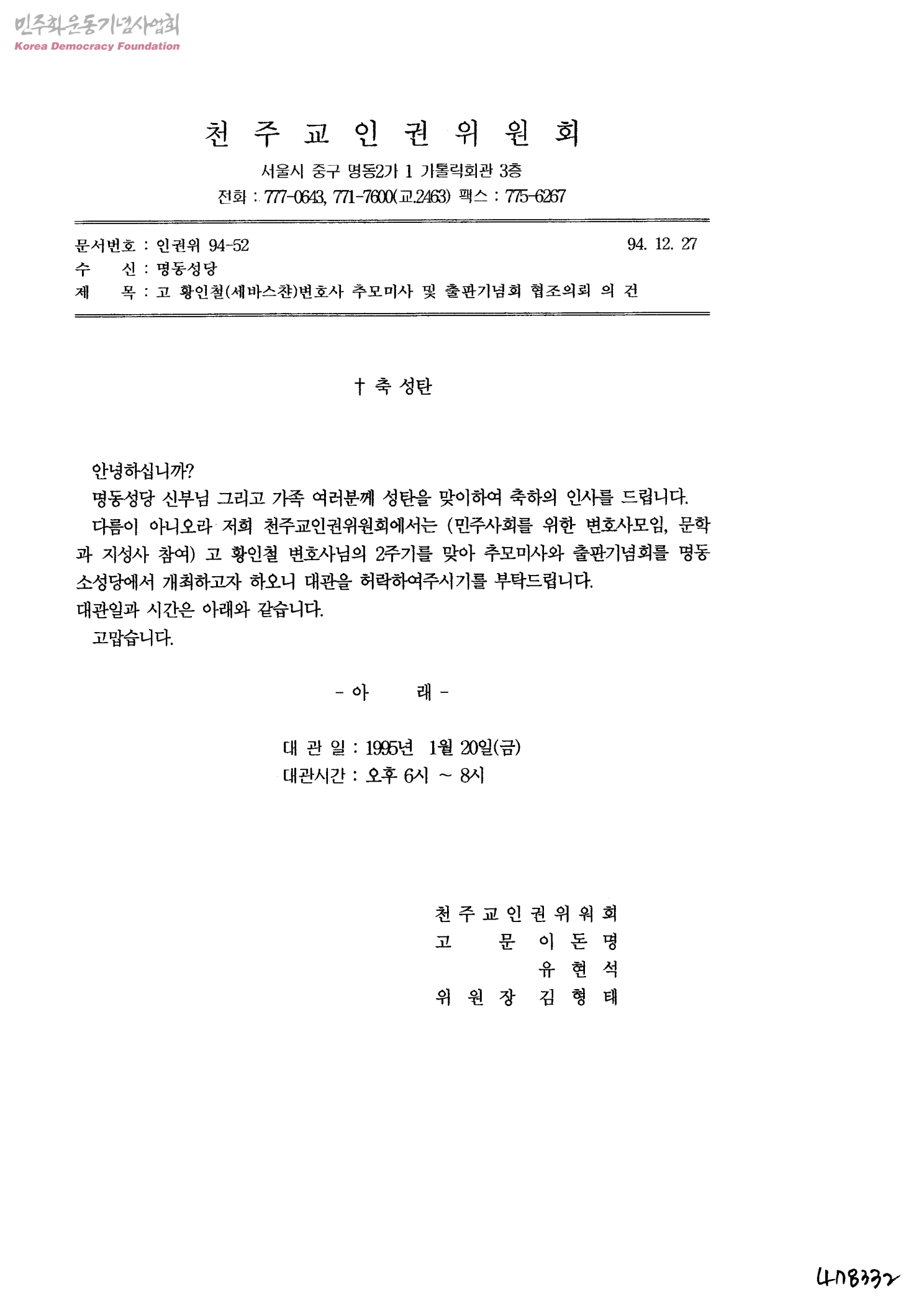 고 황인철(세바스챤)변호사 추모미사 및 출판기념회 협조의뢰 의 건[수신:명동성당]