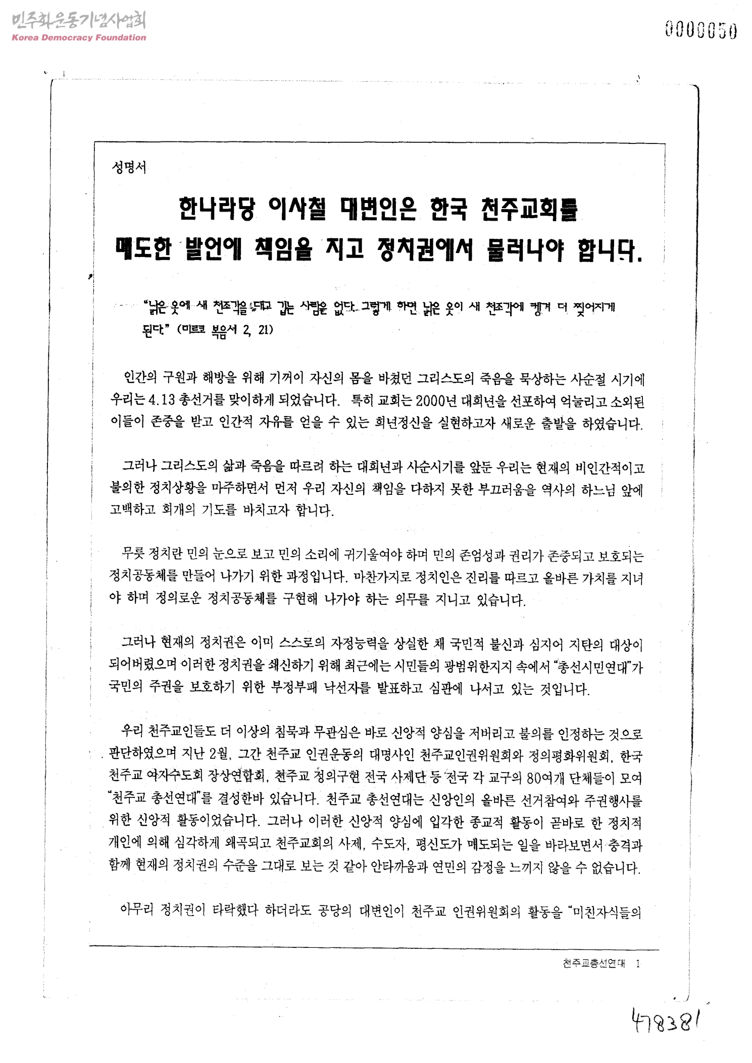 성명서-한나라당 이사철 대변인은 한국 천주교회를 매도한 발언에 책임을 지고 정치권에서 물러나야합니다.