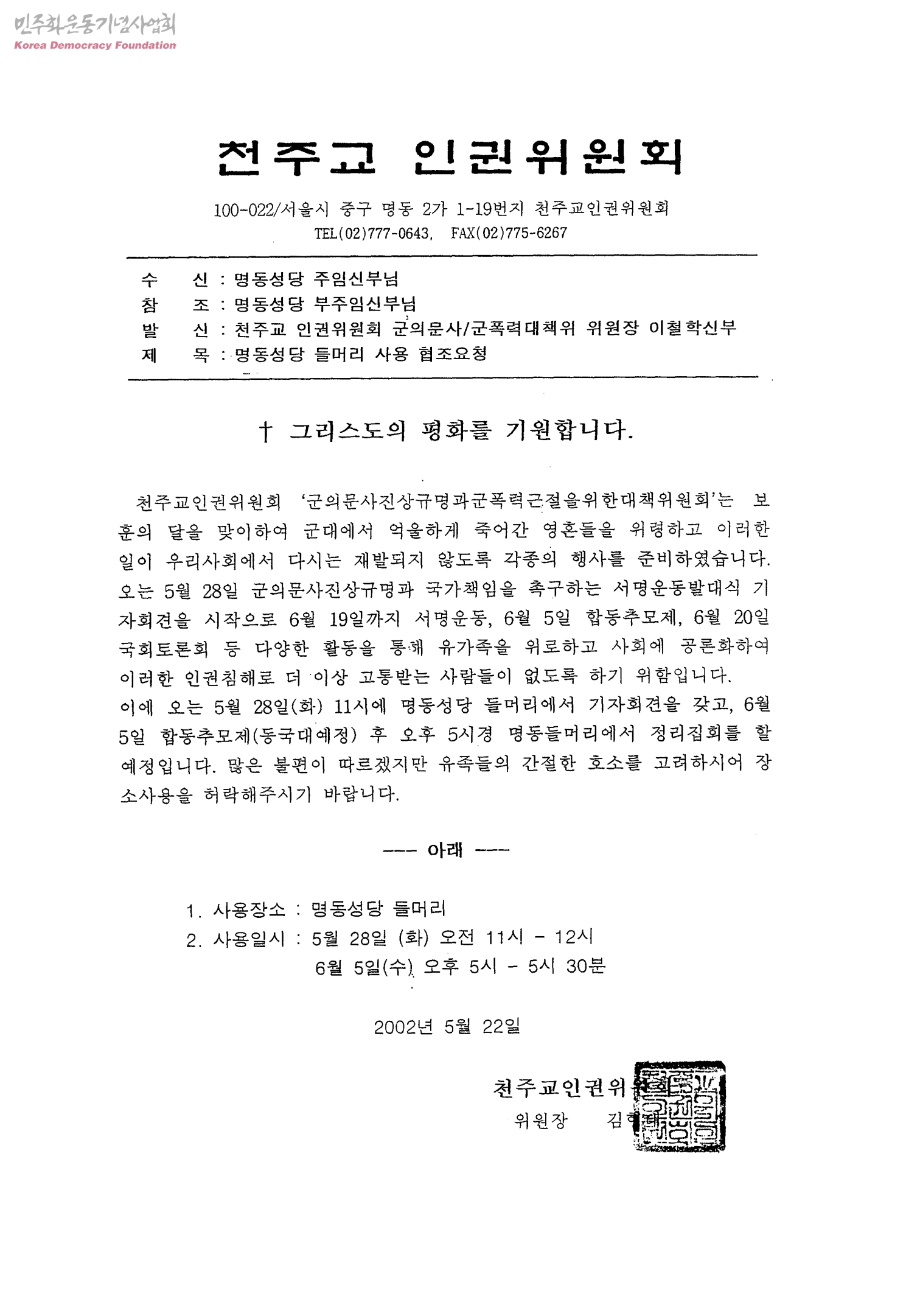 명동성당 들머리 사용 협조요청[수신:명동성당 주임신부]