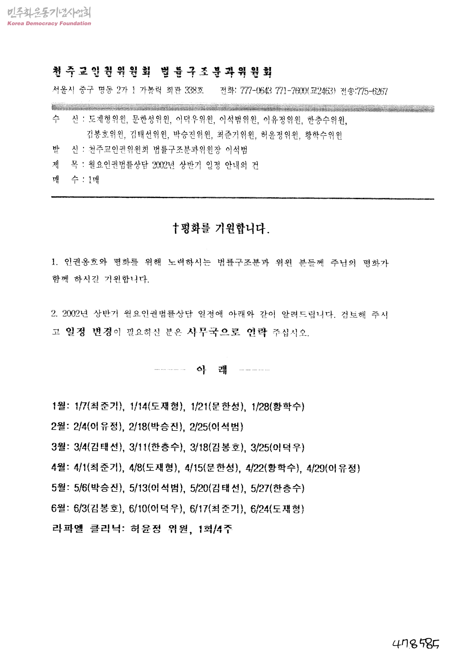월요일인권법률상담 2002년 상반기 일정 안내의 건[수신:도재형위원, 문한성위원, 이덕우위원, 이석범위원, 이유정위원, 한충수위원, 김봉호위원, 김태선위원, 박승진위원, 최준기위원, 허윤정위원, 황학수위원, 발신:천주교인권위원회 법률구조분과위원장 이석범]