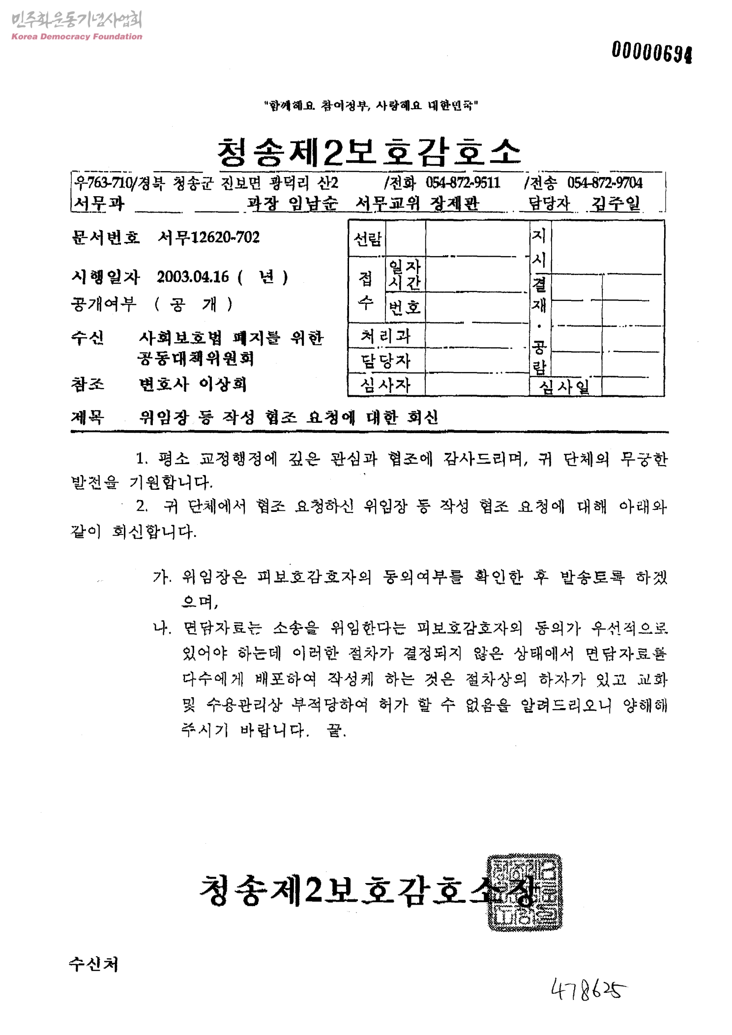 위임장 등 작성 협조 요청에대한회신[수신:사회보호법폐지를 위한 공동대책위원회]