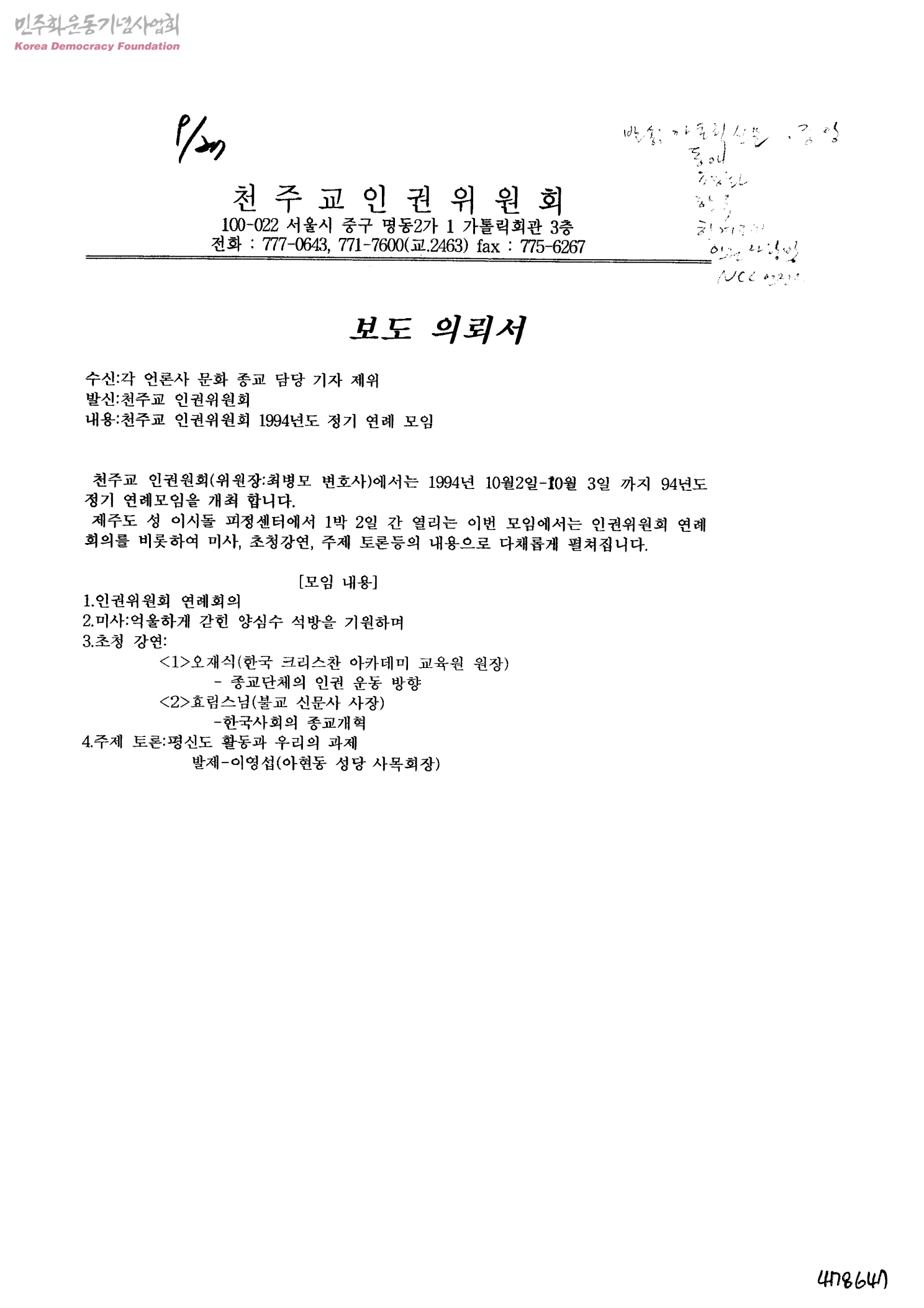 천주교 인권위원회 1994년도 정기 연례 모임[수신:각 언론사 문화 종교 담당 기자 제위, 발신:천주교 인권위원회]