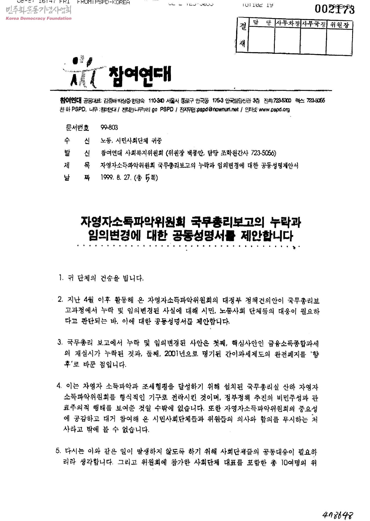 자영자소득파악위원회 국무총리보고의 누락과 임의변경에 대한 공동성명제안서[수신:노동, 시민사회단체, 발신:참여연대, 사회복지위원회]