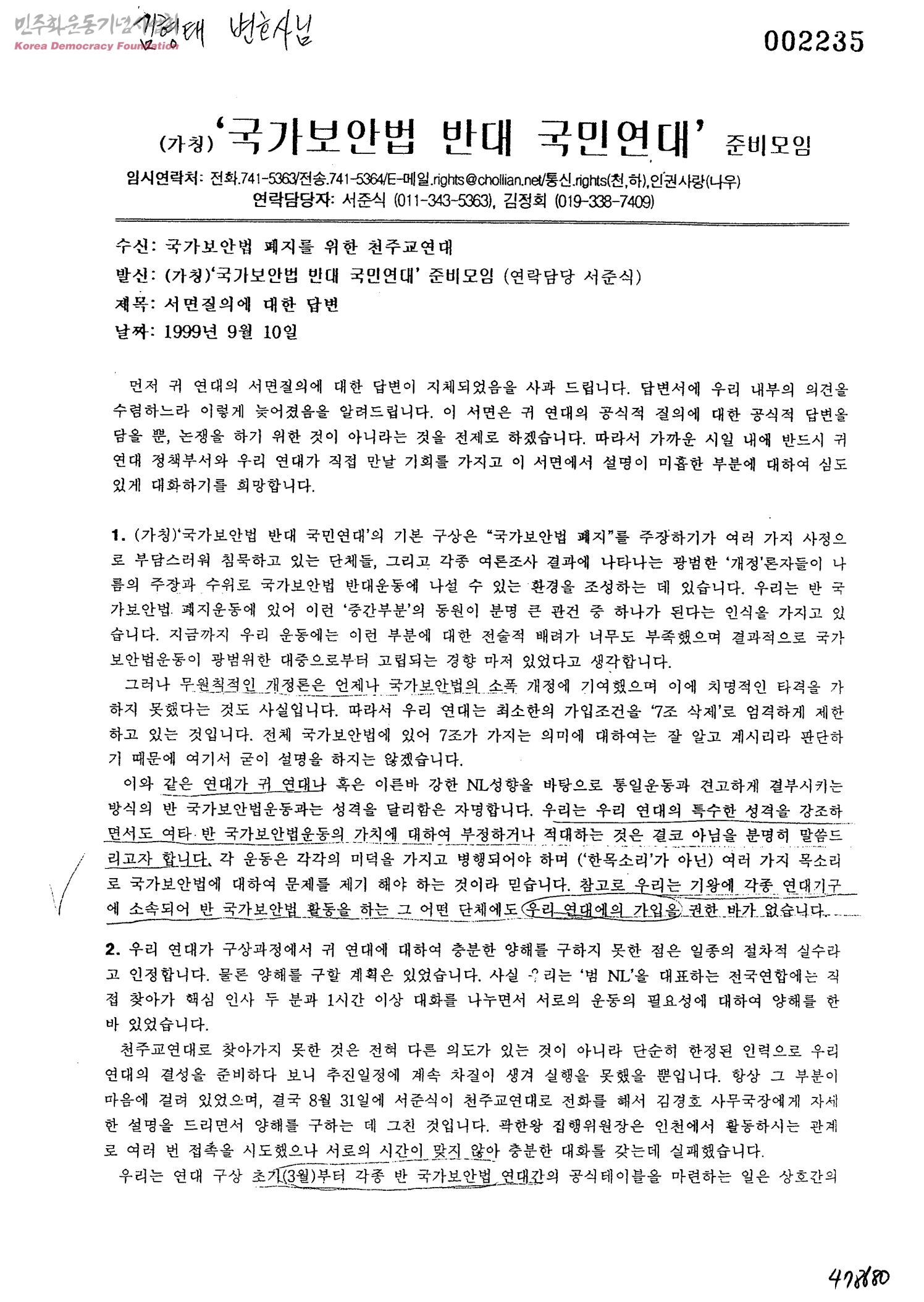 서면질의에 대한 답변[수신:국가보안법 폐지를 위한 천주교연대, 발신:(가칭)'국가보안법 반대 국민연대'준비보임]