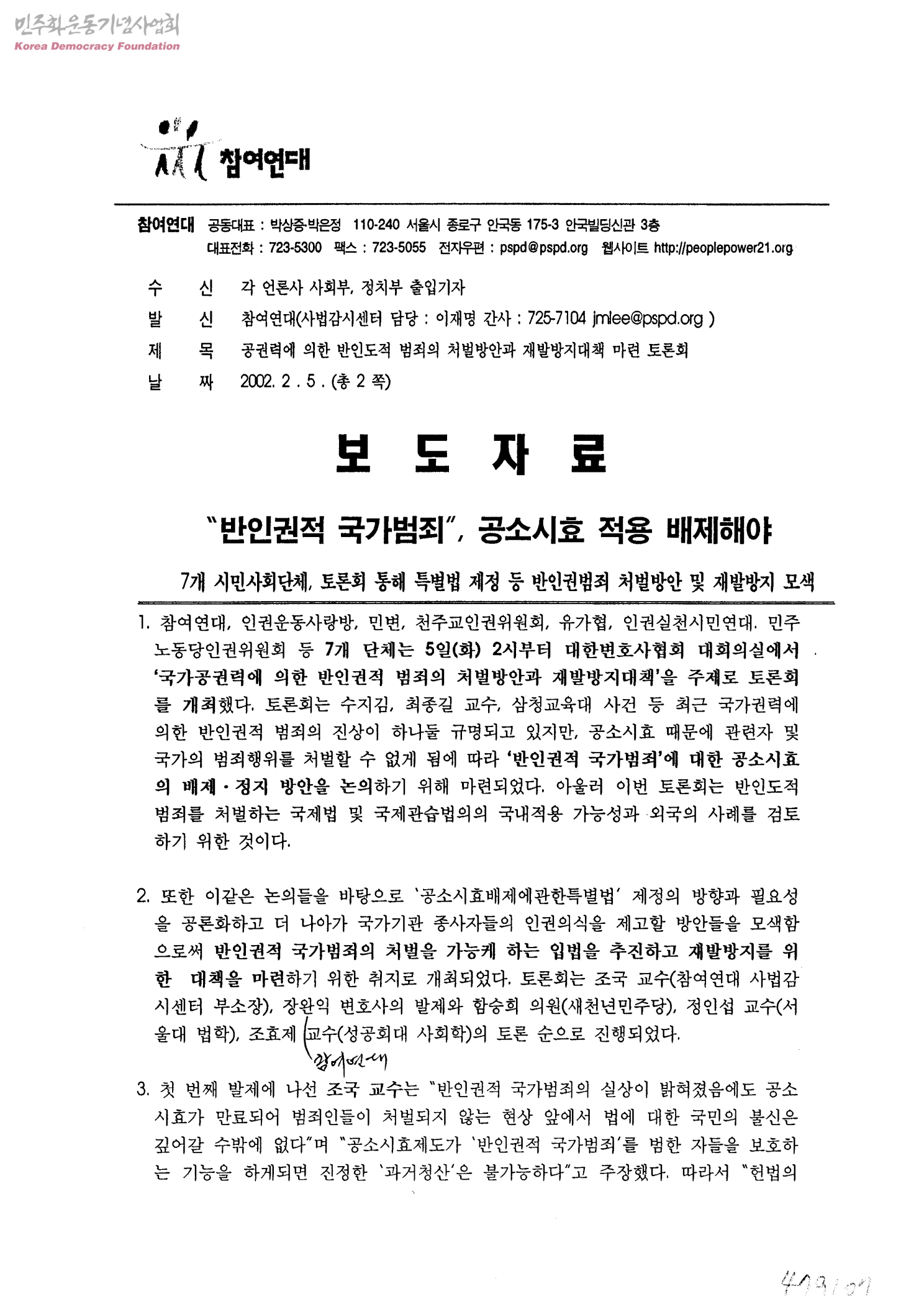 공권력에 의한 반인도적 범죄의 처벌방안과 재발방지대책 마련 토론회[수신:각 언론사 사회부, 정치부 출입기자]
