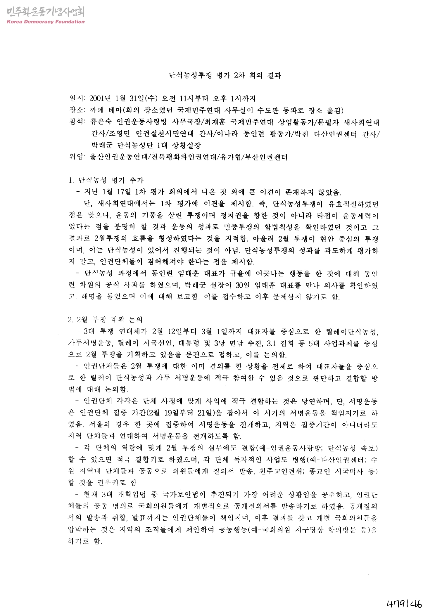 단식농성투쟁 평가 2차 회의 결과