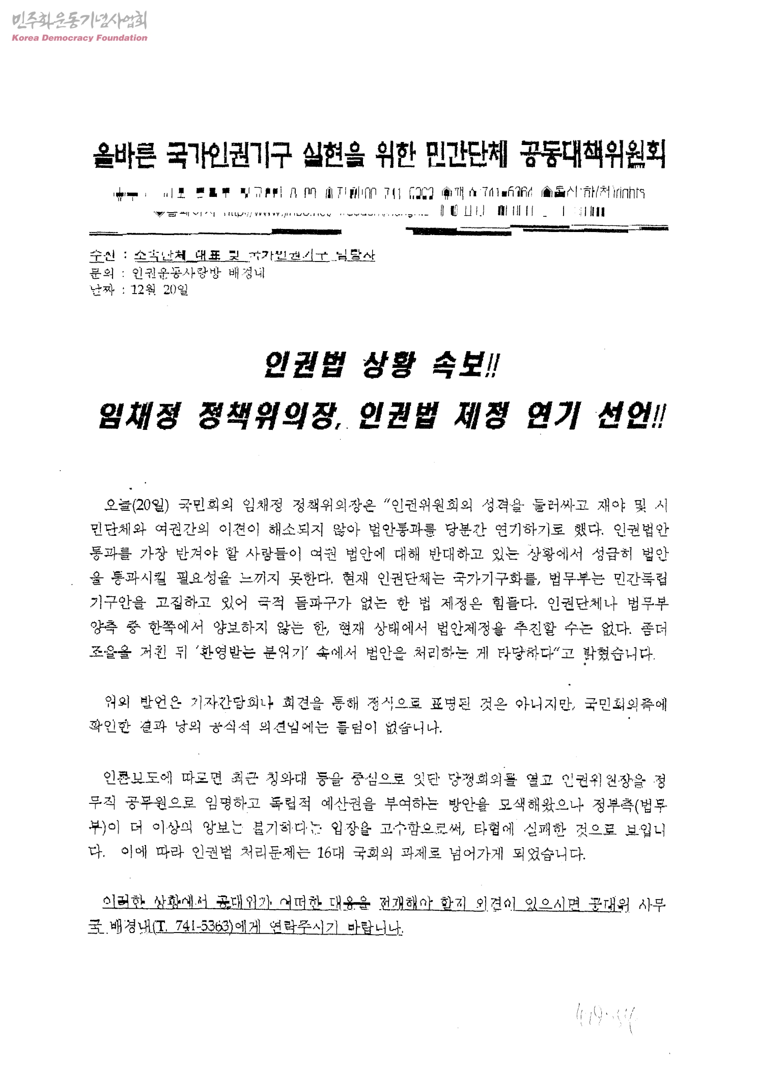 올바른국가인권기구실현을위한민간단체공동대책위원회-인권법 상황속보!! 임채정 정책위위장,인권법 제정 연기 선언!![수신:소속단체 대표 및 국가인권기구 담당자]
