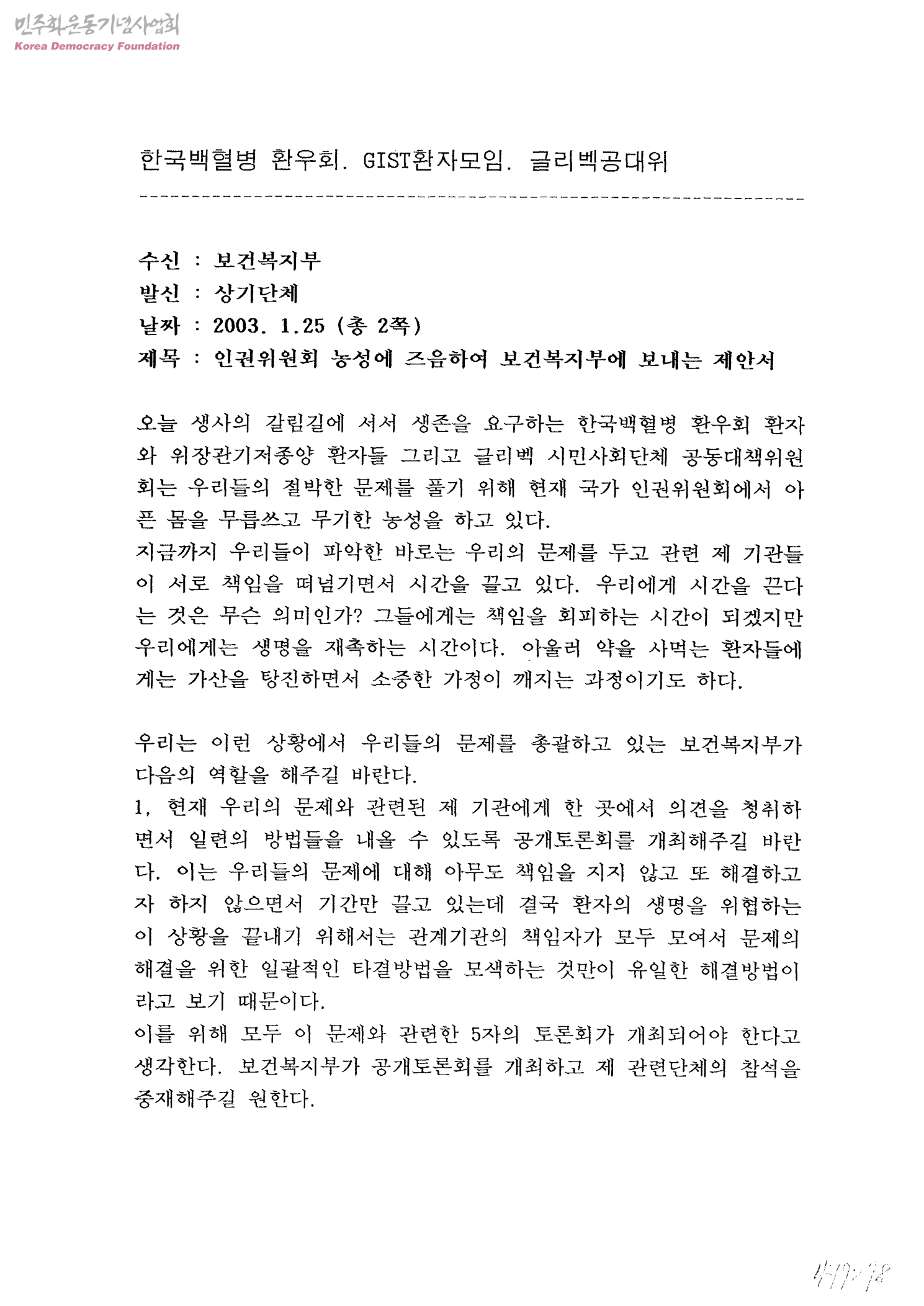 인권위원회 농성에 즈음하여 보건복지부에 보내는 제안서[수신:보건복지부]