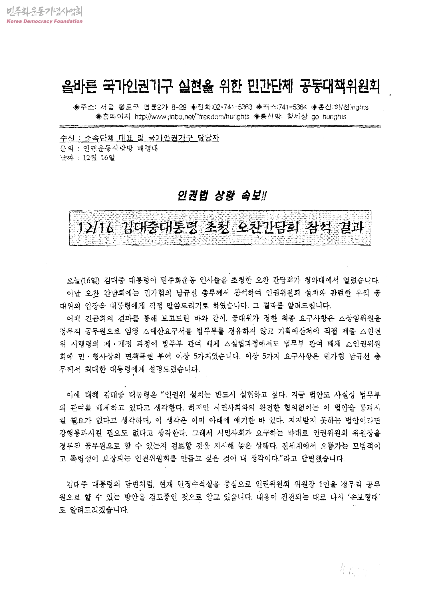 올바른국가인권기구실현을위한민간단체공동대책위원회-인권법상황속보!! 12/16김대중대통령 초청 오찬간담회 참석결과[수신:소속단체 대표 및 국가인권기구 담당자]