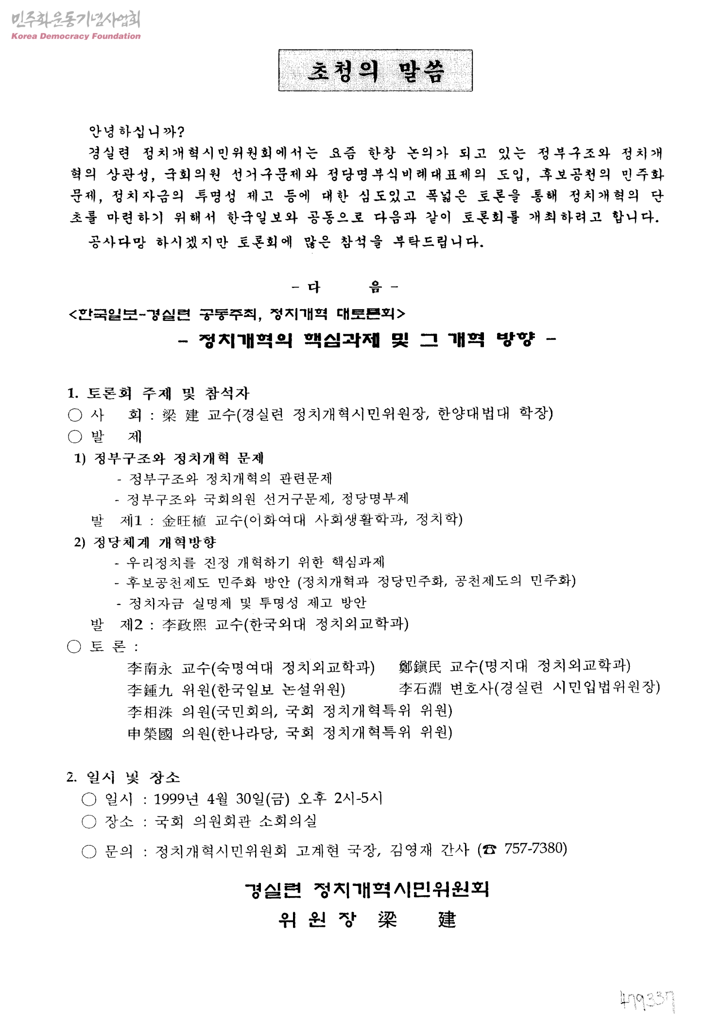초청의말씀 한국일보-경실련공동주체, 정치개혁 대 토론회-정치개혁의 핵심과제 및 그 개혁방향