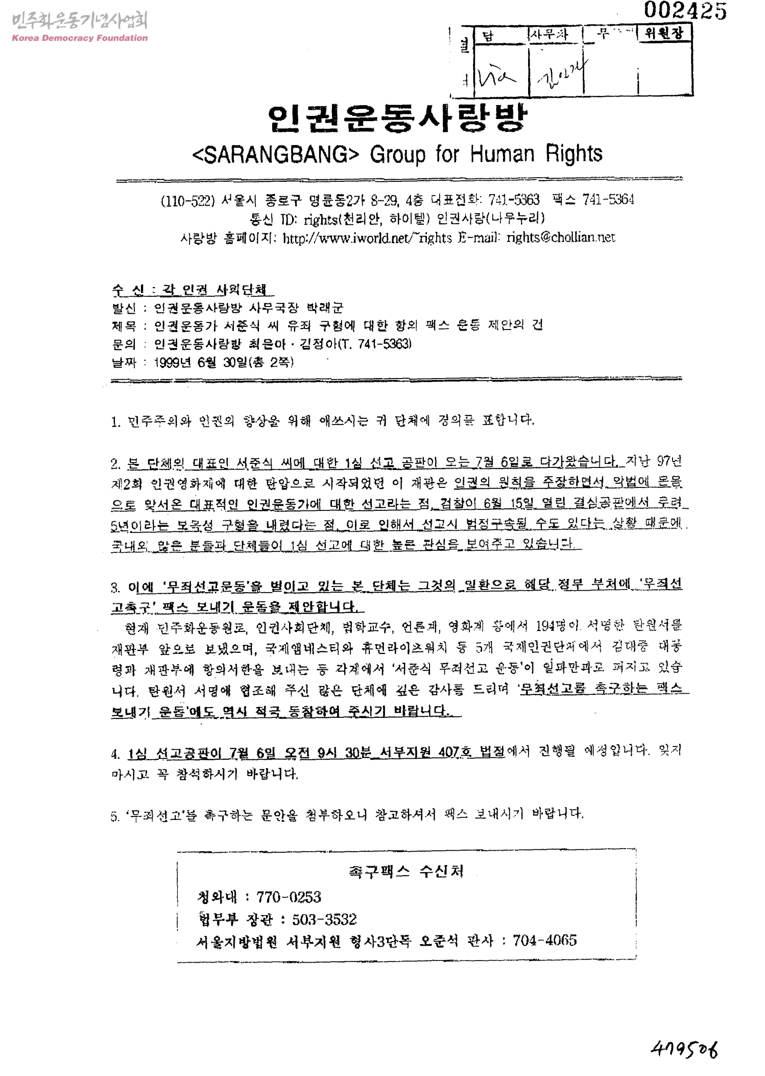 인권운동가 서준식 씨 유죄 구형에 대한 한의 팩스 운동 제안의 건[수신:각 인권 사회단체, 발신:인권운동사랑방 사무국장 박래군]