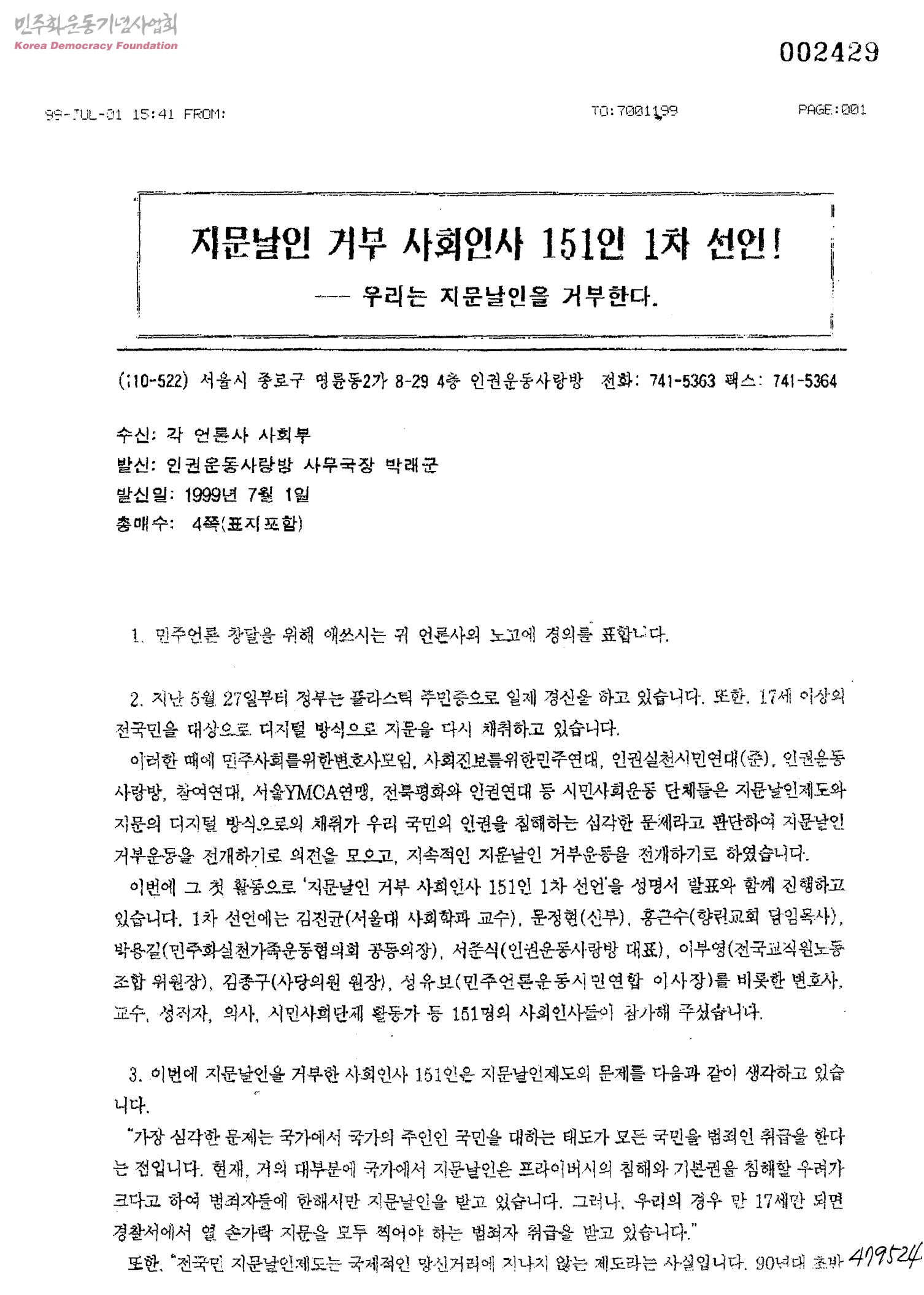 지문날인 거부 사회인사 151인 1차 선언!-우리는 지문날인을 거부한다[수신:각 언론사 사회부, 발신:인권운동사랑방 사무국장 박래군]