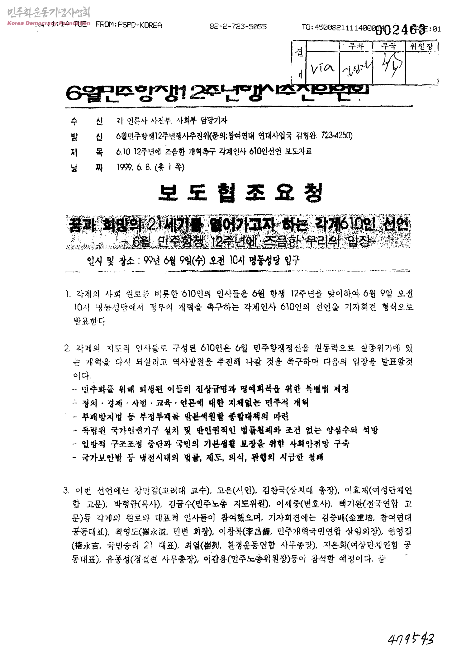 6.10 12주년에 즈음한 개혁촉구 각계인사 610인선언 보도자료[수신:각 언론사 사진부, 사회부 담당기자, 발신:6월민주항쟁12주년행사추진위]