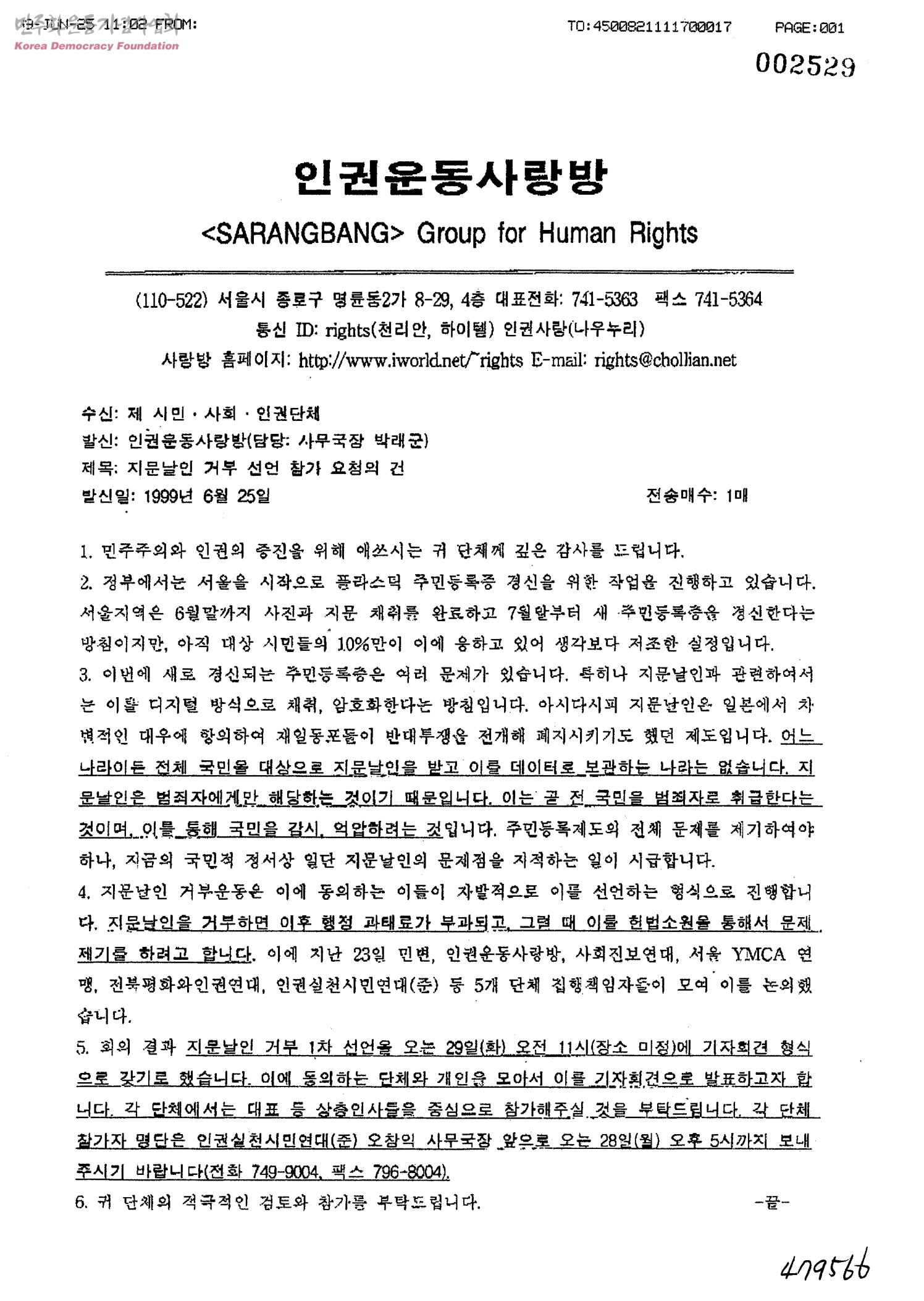 지문날인 거부 선언 참가 요청의 건[수신:제 시민·사회·인권단체, 발신:인권운동사랑방]