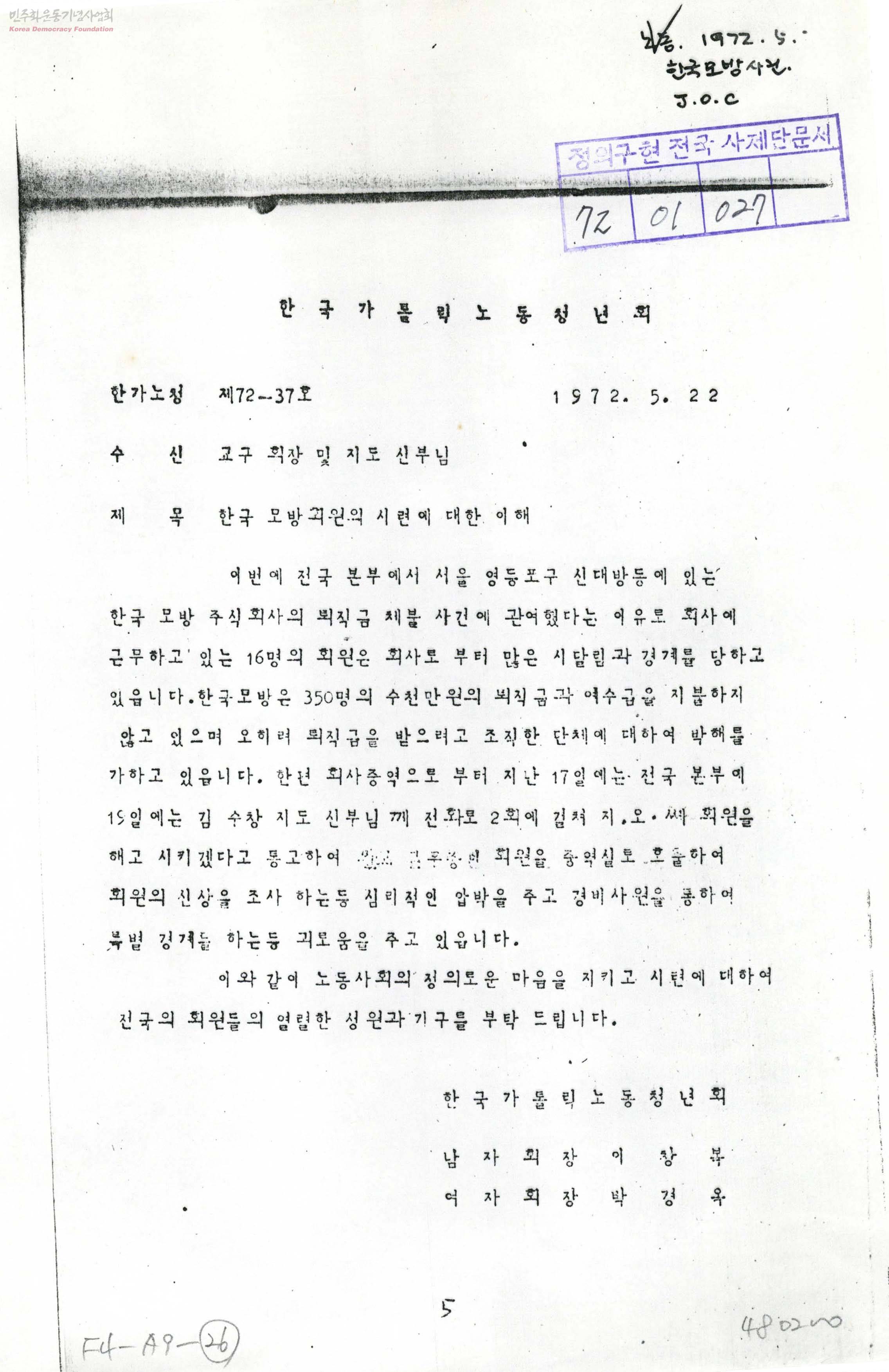- 한국모방 주식회사의 퇴직금 체불 사건에 관여했다는 이유로 회원이 회사로 부터 많은 시달림을 당하고 있다. 전국 회원들의 열렬한 성원을 부탁드린다.