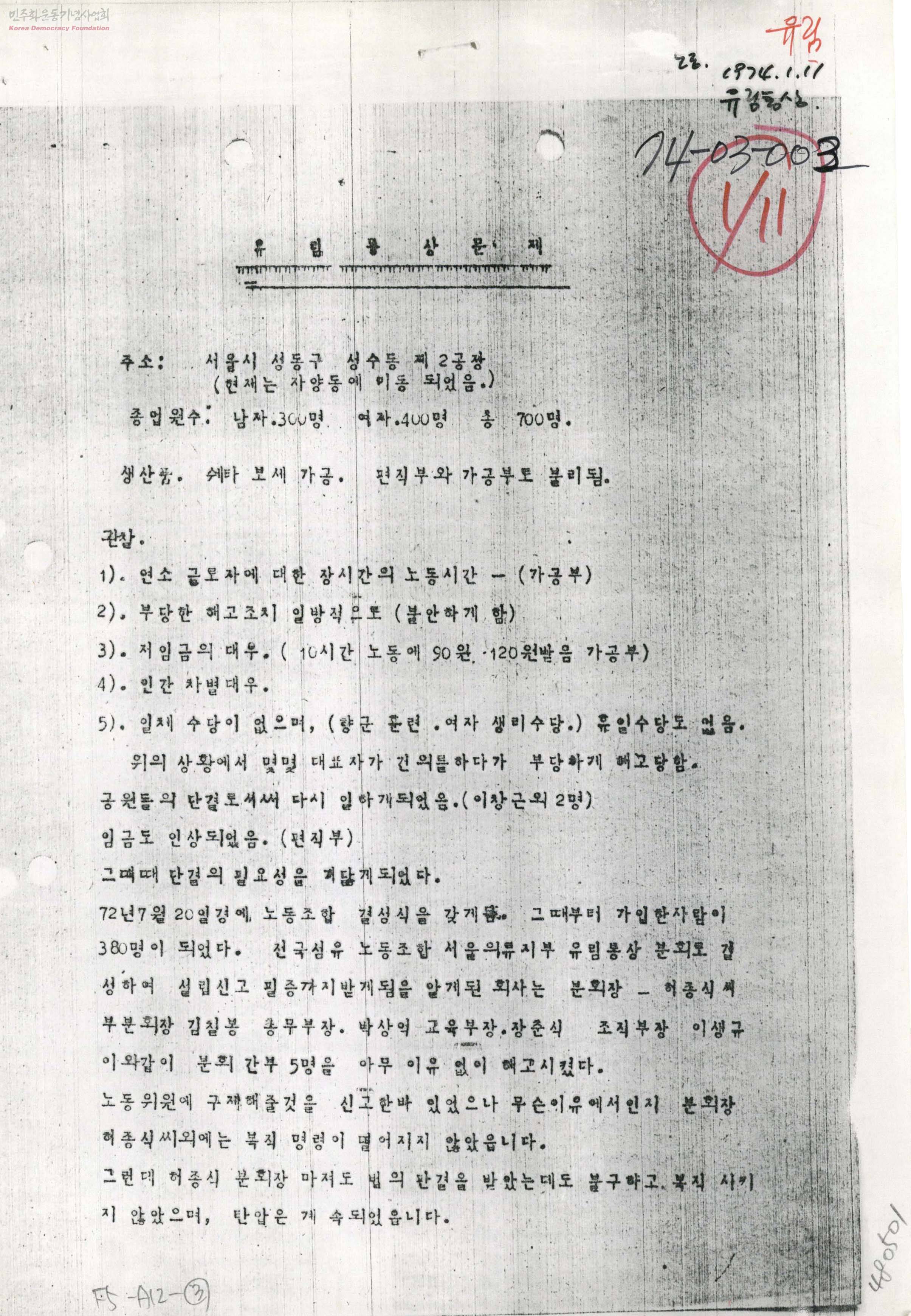- *70년대 박정희 군사독재 정권의 노동조합 탄압 및 노동자의 착취당한 제 권리를 되찾기 위한 싸움에서 업종별 노동조합에 가해진 박해를 유림통상의 사례를 통해 보여주고 있다. 관찰 1)연소 근로자에 대한 장시간의 노동시간 2) 부당한 해고조치 일방적으로 3) 저임금의 대우 4) 인간차별대우 등