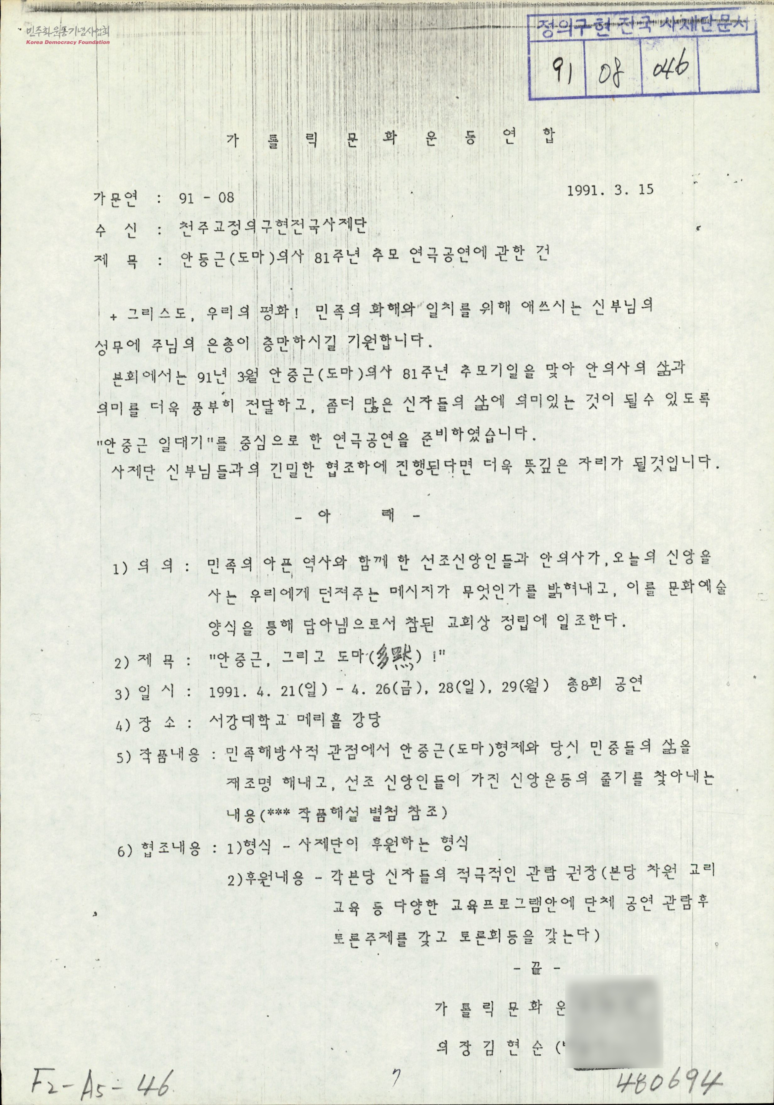 안중근(도마)의사 81주년 추모 연극공연에 관한 건 [수신:천주교정의구현전국사제단. 발신:가톨릭문화운동연합]