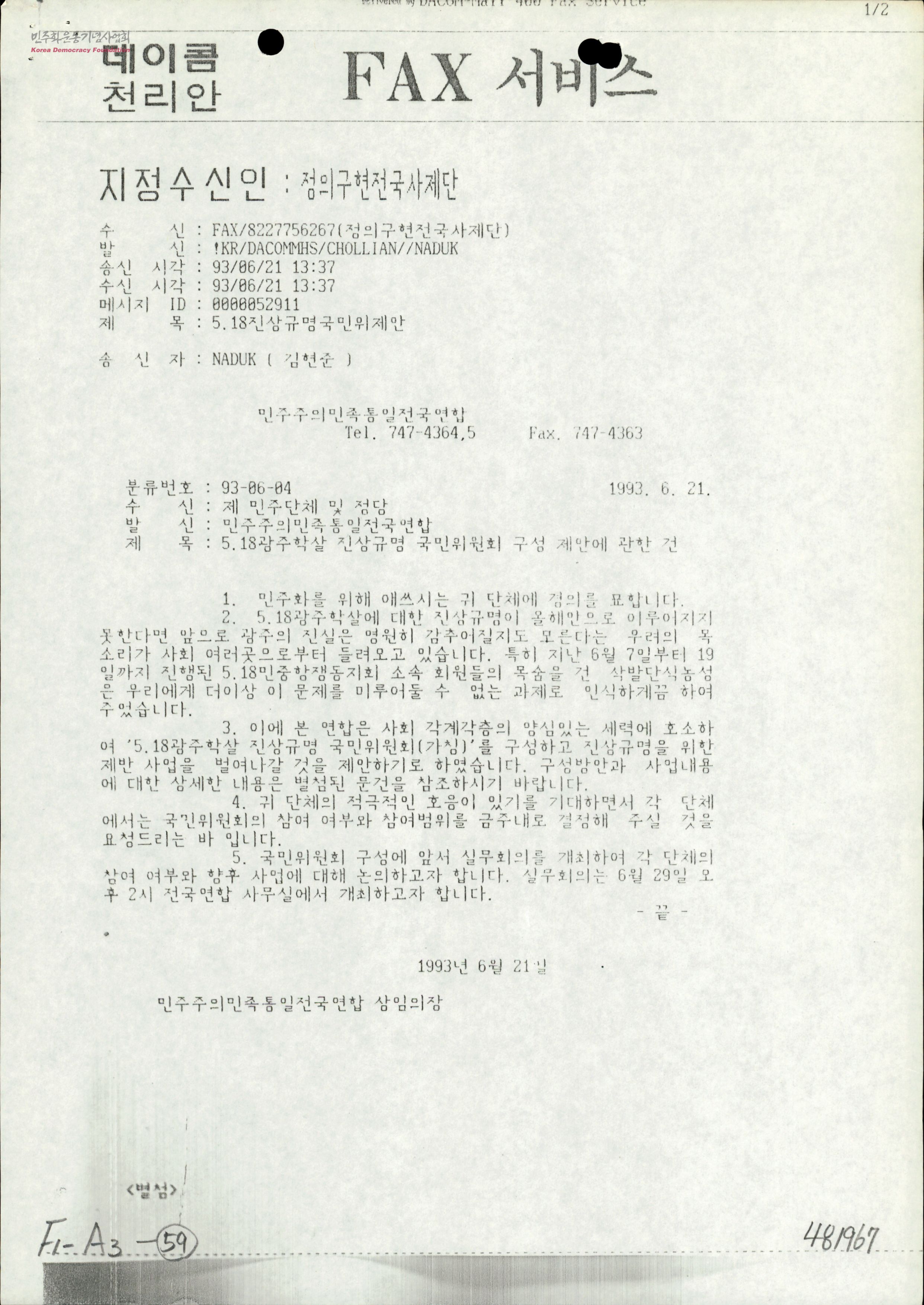 5.18광주학살 진상규명 국민위원회 구성 제안에 관한 건 [수신:정의구현전국사제단. 발신:민주주의민족전국연합]