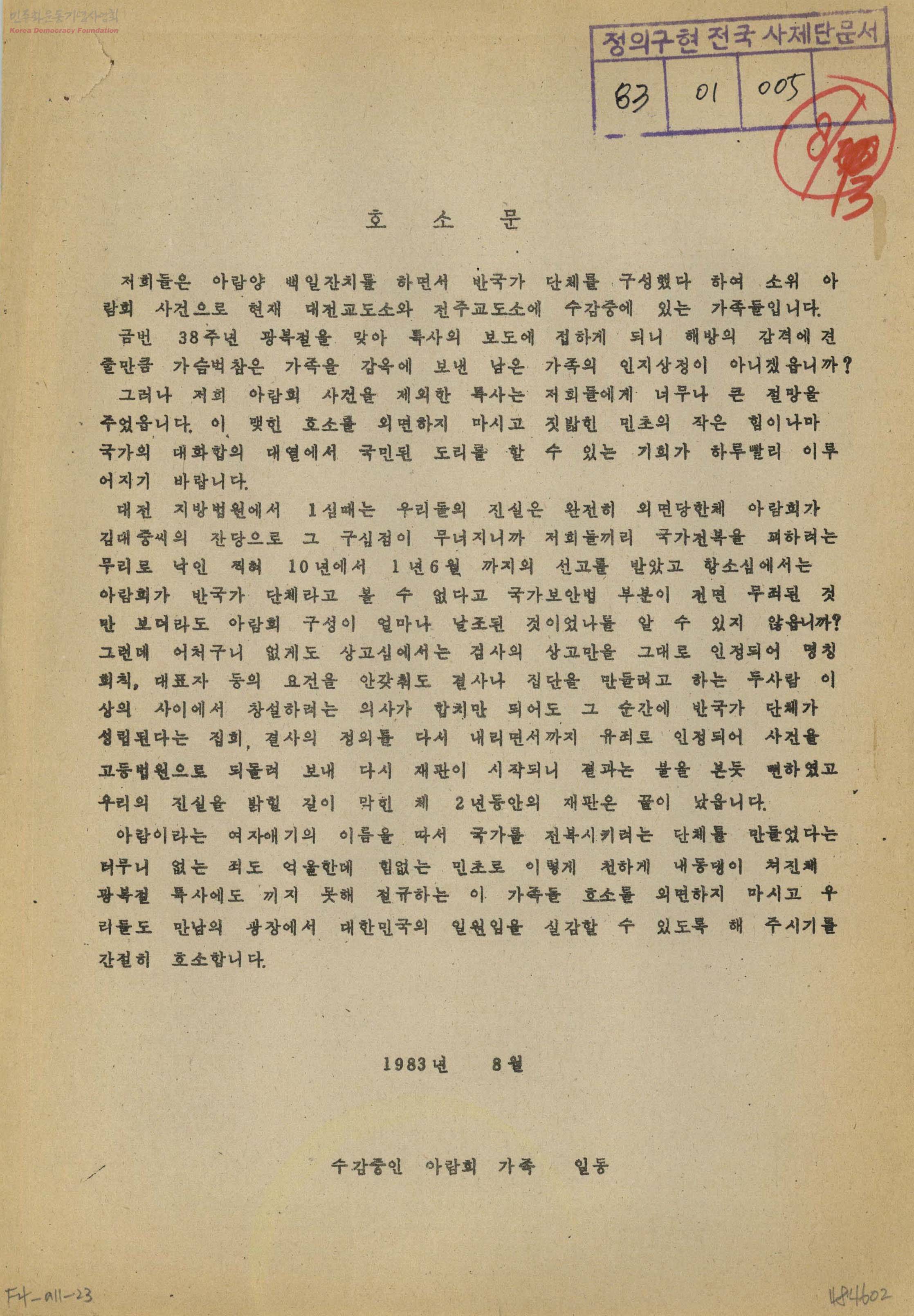호소문[아람회사건 구속자 석방 호소]