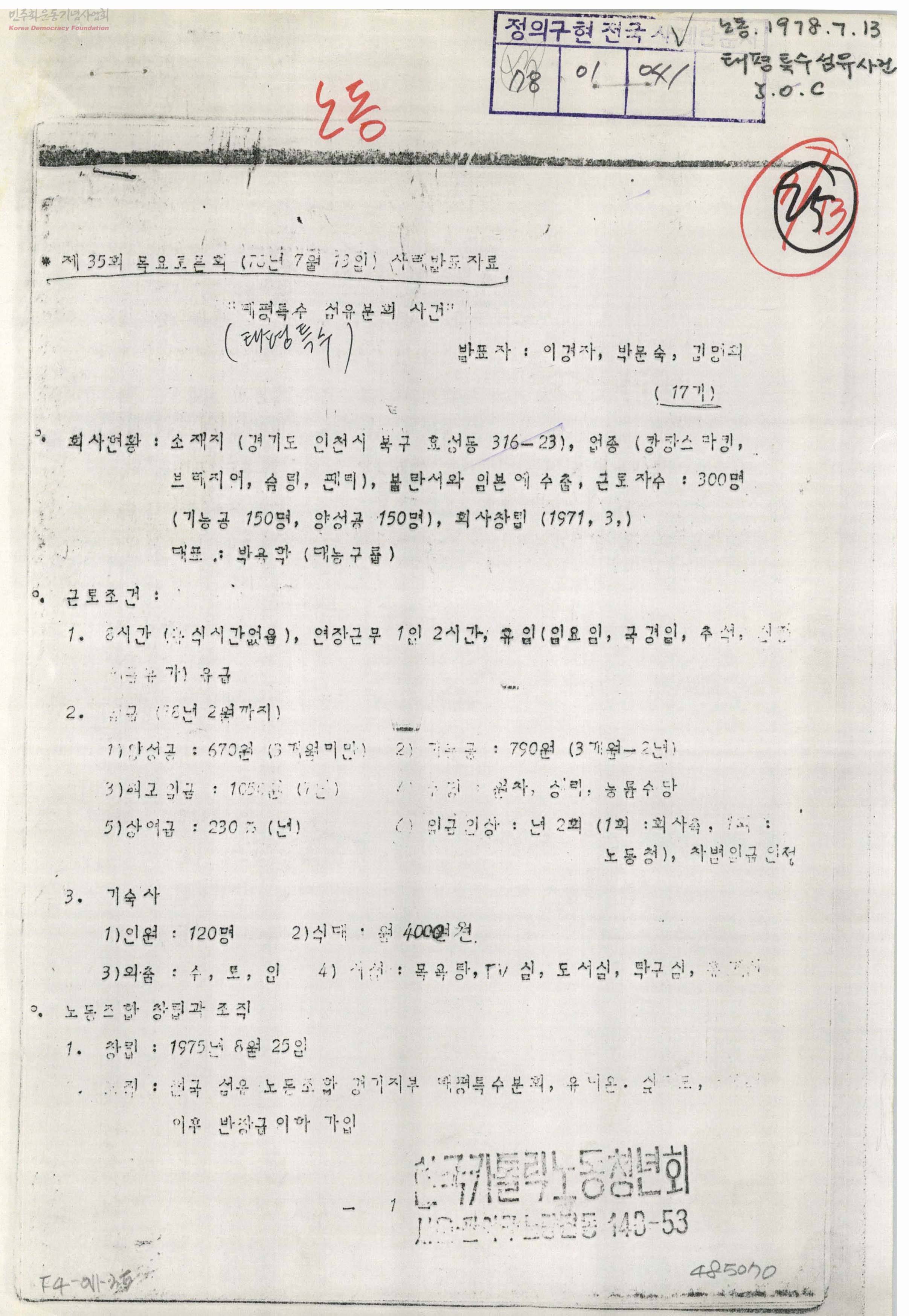 제35회 목요토론회(78년 7월 13일) 사례발표 자료-태평특수 섬유분회 사건
