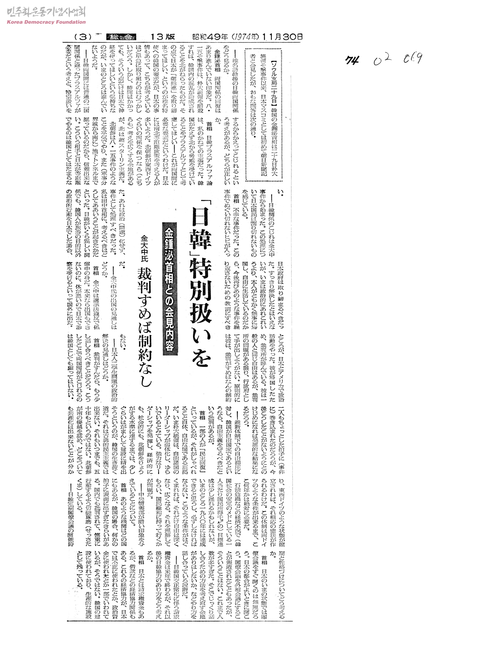 [신문스크랩]金鍾泌首相との會見內容