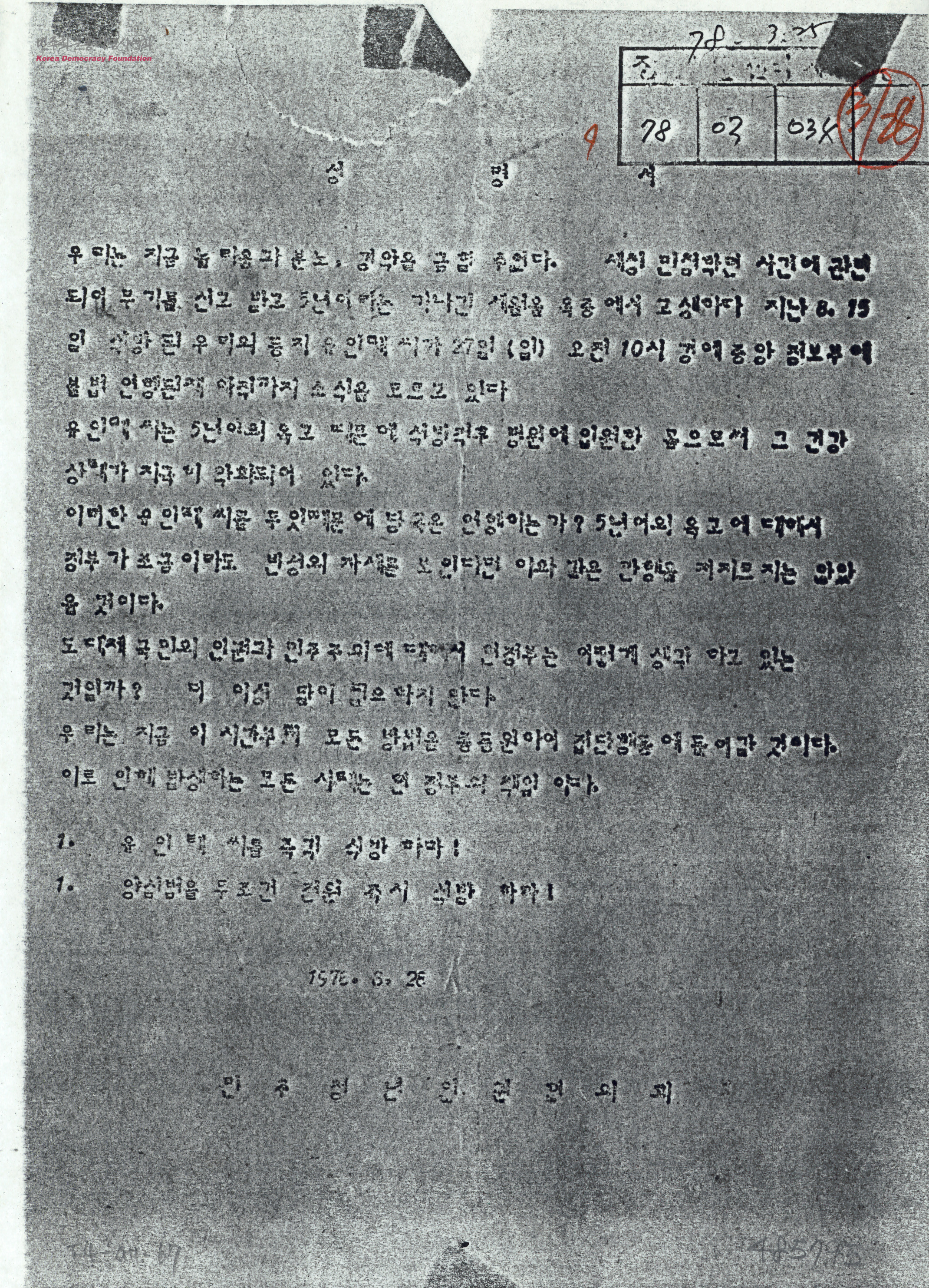 - 생산자 및 기증자가 ‘박용수’인 사진의 사용은 구매신청을 클릭하여 직접 사진 구매 신청을 하실 수 있습니다. 생산자 및 기증자가 ‘경향신문사’인 사진의 사용은 경향신문사 담당자(02-3701-1635)를 통해 구매하실 수 있습니다. 그 외의 생산자 및 기증자는 민주화운동기념사업회 사료관 담당자( h_jungwon@kdemo.or.kr / 031-361-9586 )에 문의바랍니다.
