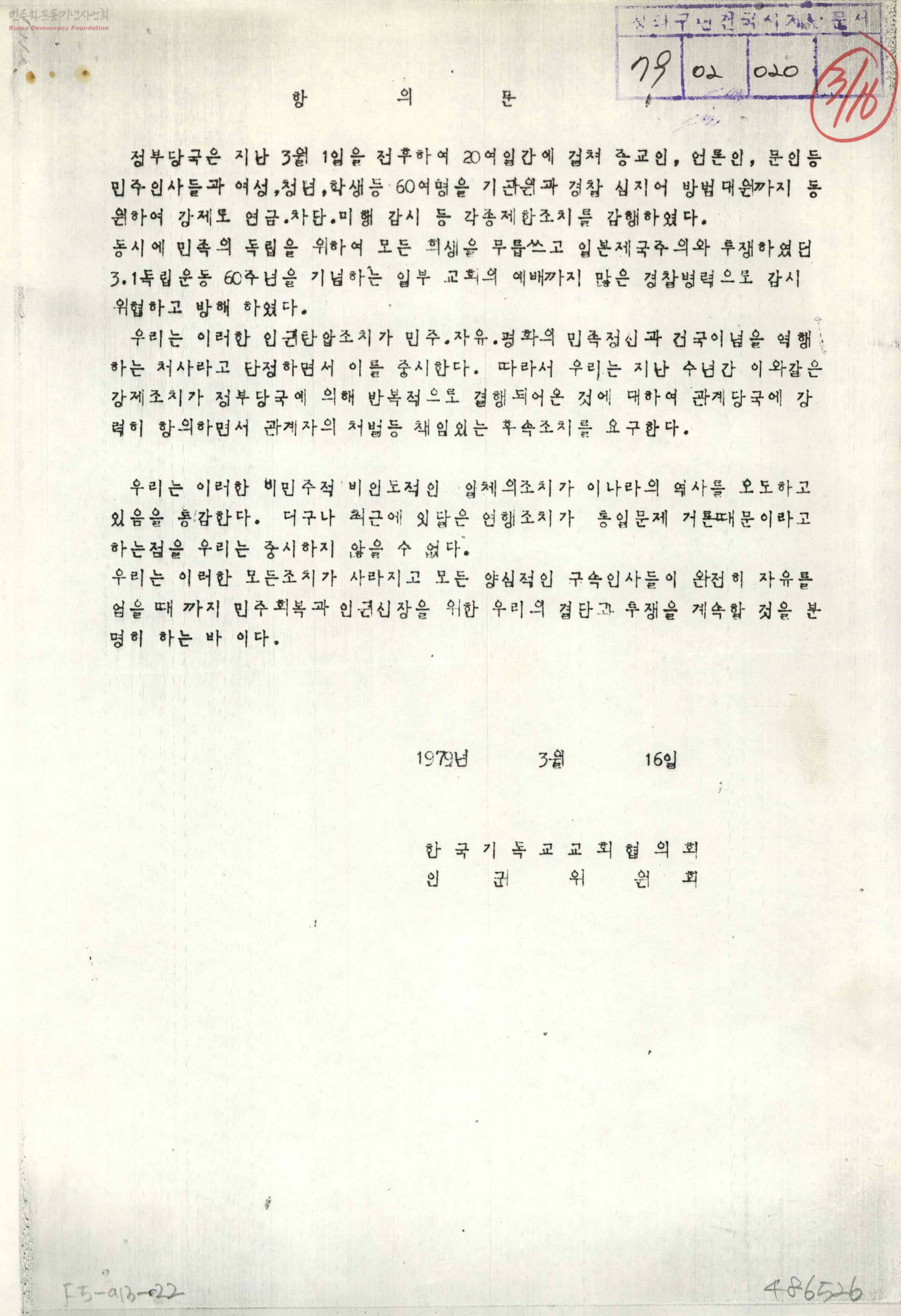 항의문[3.1절 전후 각계 인사 구속 연행 관련]