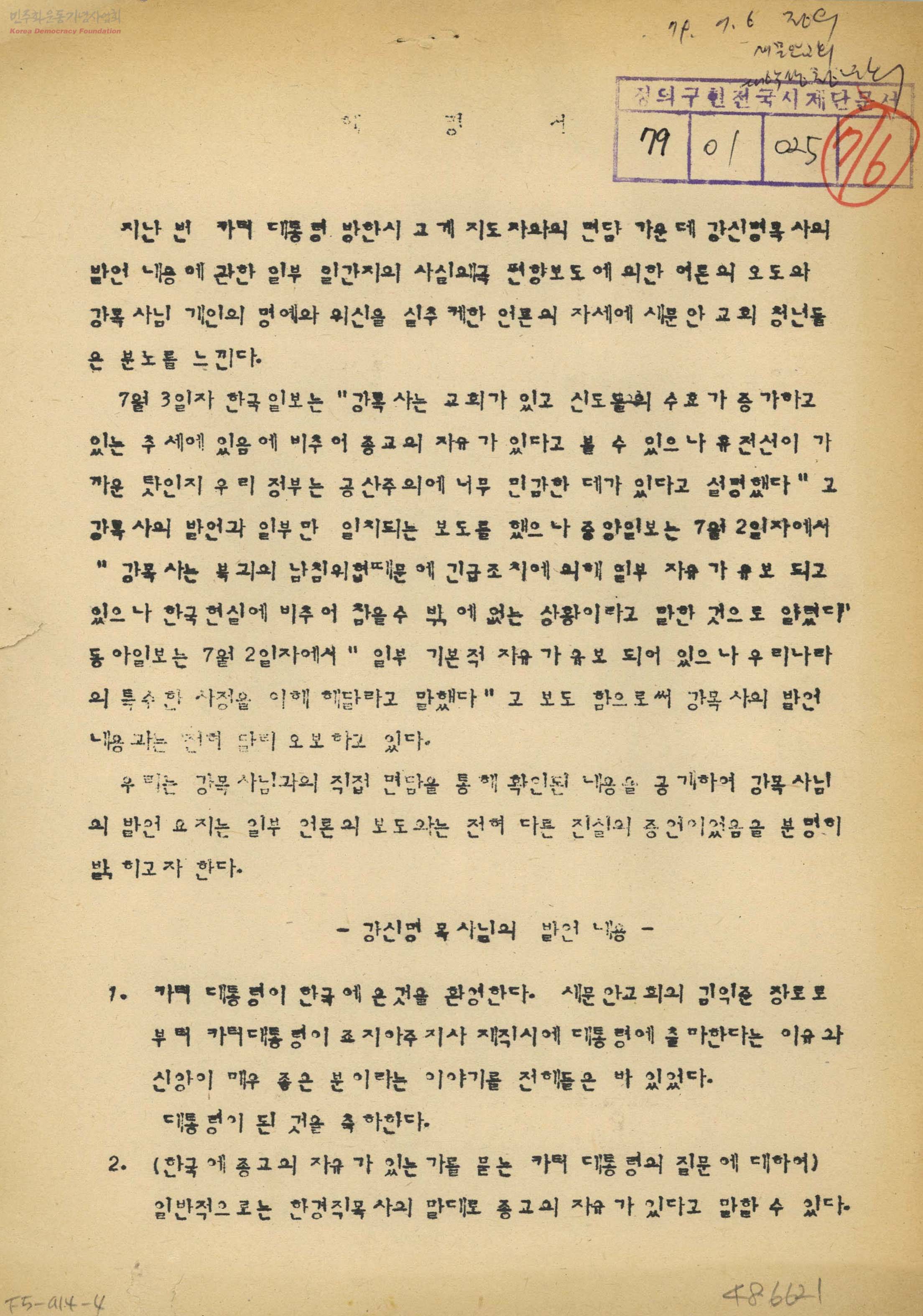 - 카터대통령 방한시 강신명 목사 발언 관련하여, 북한의 남침위 때문에 긴급조치로 일부 자유가 유보되는 것은 참을 수 밖에 없다고 했다는 동아일보의 보도는 사실을 호도하는 오보이다