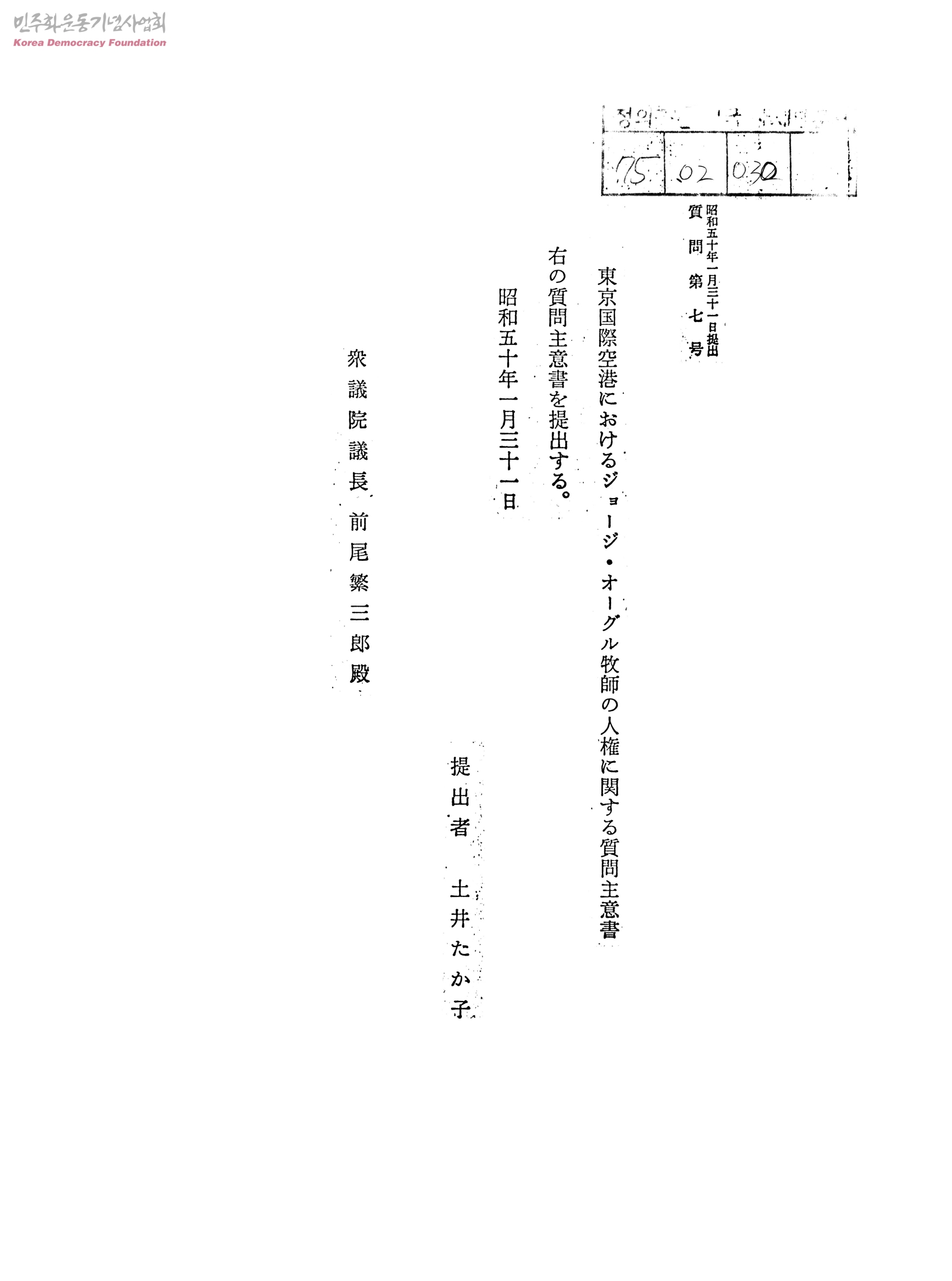 東京國際空港におけるジョ一ジ.オ一グル牧師の人權に關する質問主意書