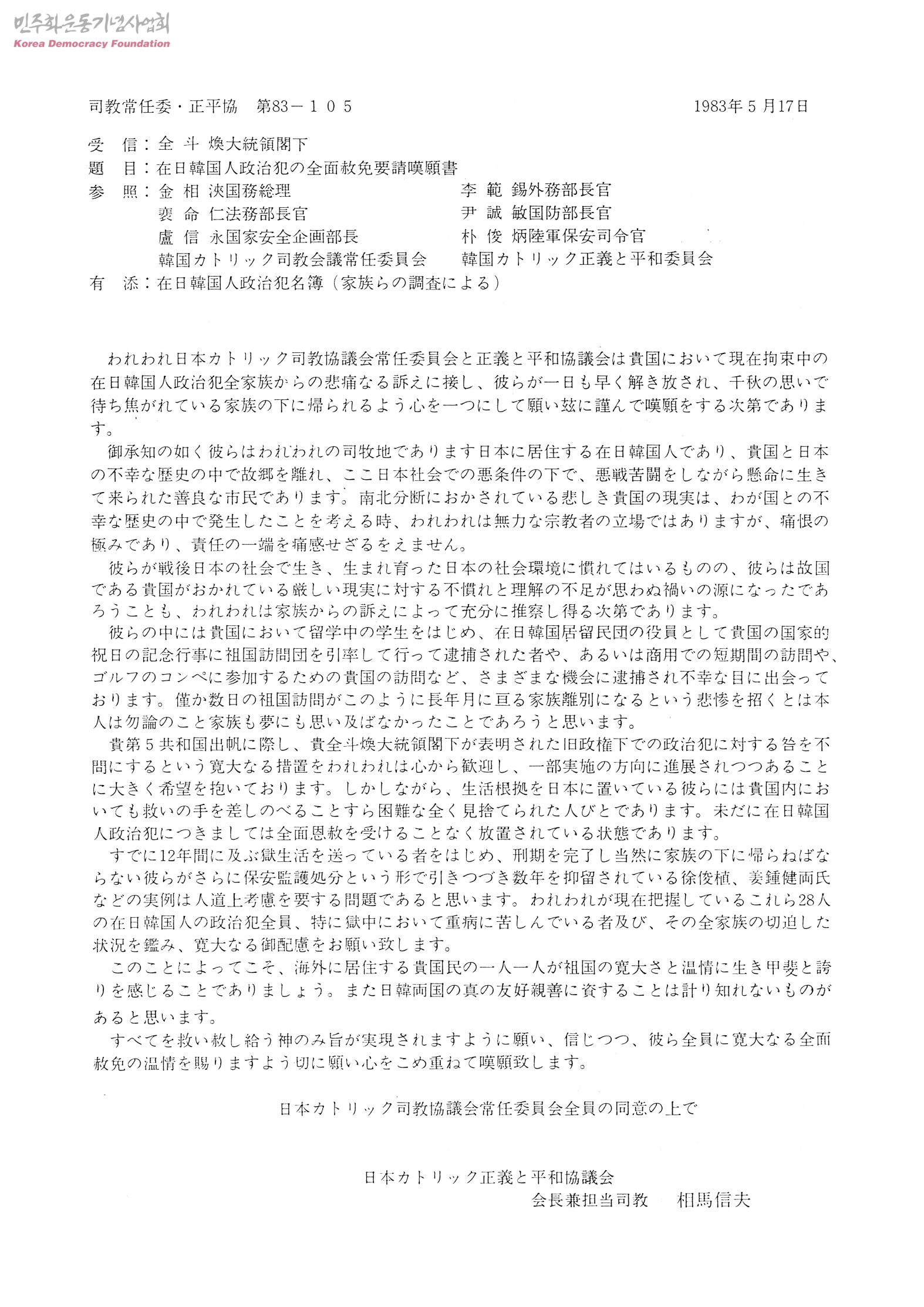 在日韓國人政治犯の全面赦免要請嘆願書