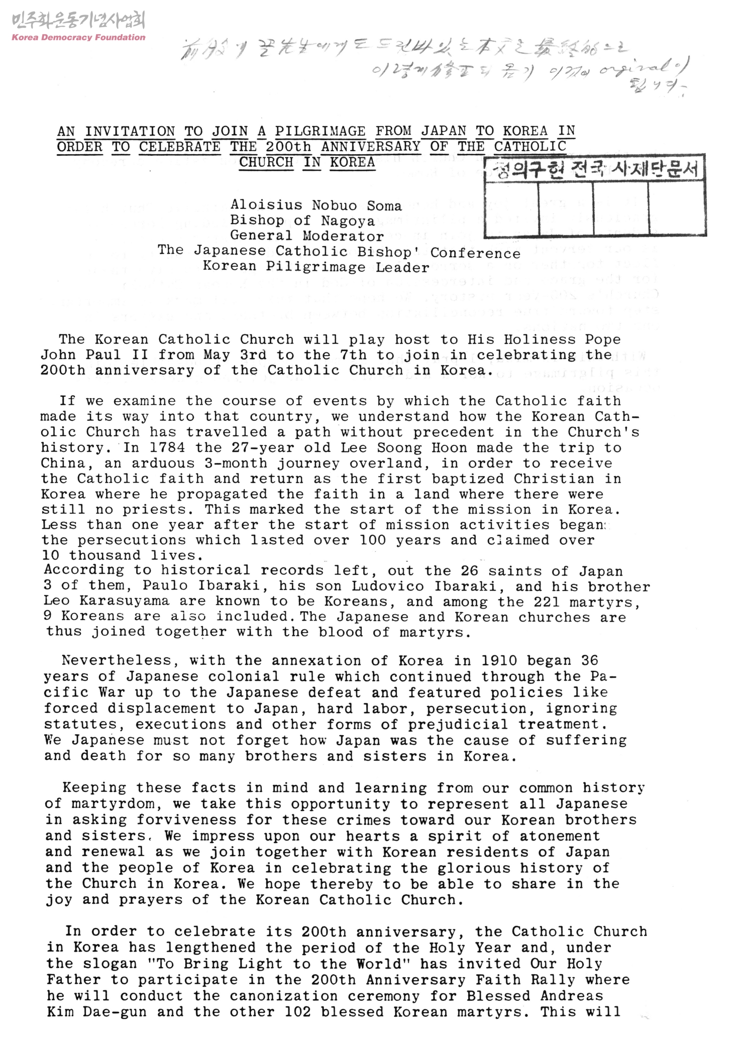 AN INVITATION TO JOIN A PILGRIMAGE FROM JAPAN TO KOREA IN ORDER TO CELEBRATE THE 200th ANNIVERSARY OF THE CATHOLIC CHURCH IN KOREA
